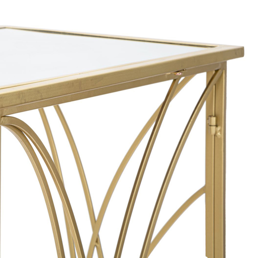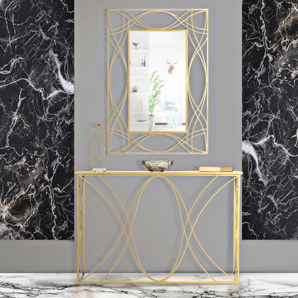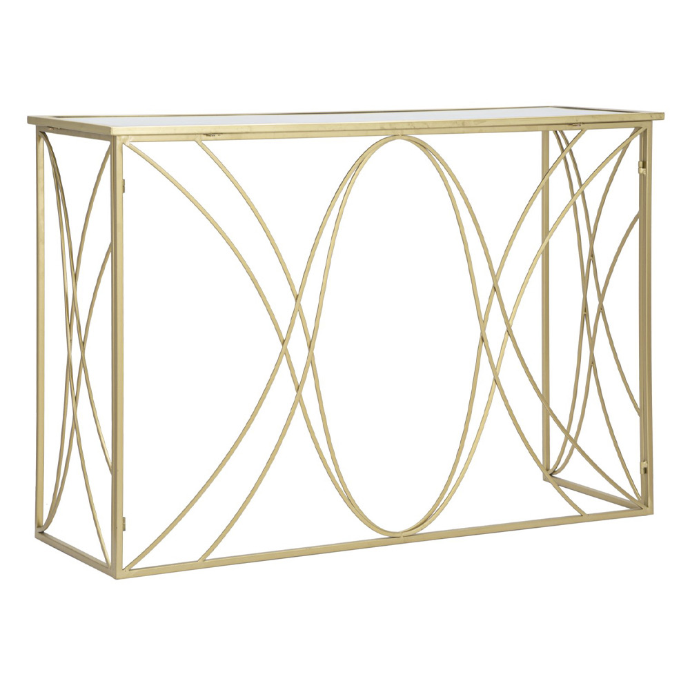 Fast entrékonsol med struktur gjord av guldfärgat järn med spegeltopp . En enkel och fängslande design som är unik och exklusiv tack vare den speciella basen som använder liniga linjer och geometriska former för att berika produktens estetik och ge en touch av personlighet . Resultatet är en raffinerad och avantgardistisk konsol, som kan anpassas till alla moderna stilsituationer tack vare sin mångsidighet och sin samtida karaktär.