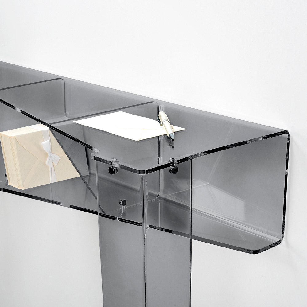 Tillverkad med 100 % högkvalitativ PMMA från jungfrulig polymer , utlovar konsolen inte bara styrka och hållbarhet , utan också en briljans och ljusstyrka som inte bleknar med tiden. Som ett riktigt konstverk fångar och reflekterar denna konsol ljus, vilket skapar en livlig och dynamisk atmosfär i alla utrymmen.