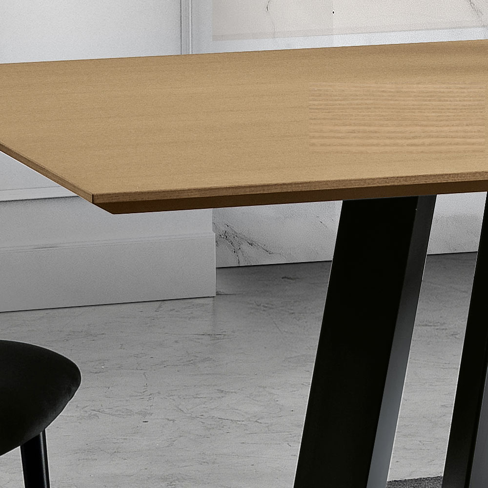 Strukturen stöds av metallben som flätas samman i djärva geometriska former, som kombinerar soliditet och avantgardistisk design. Kontrasten mellan värmen från träskivan och metallens industriella karaktär skapar en fantastisk visuell balans, vilket gör denna del perfekt för ett brett utbud av interiörer, från klassiskt till modernt.
