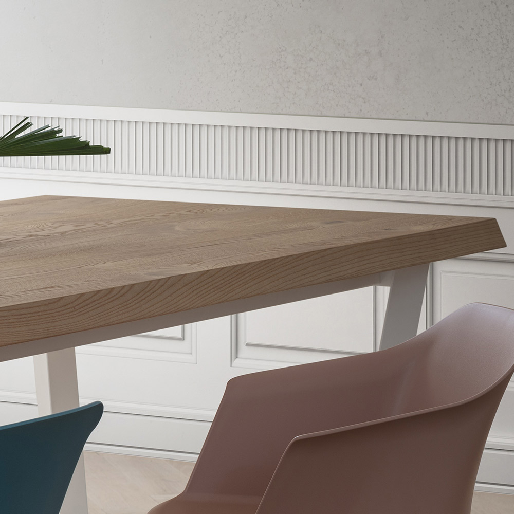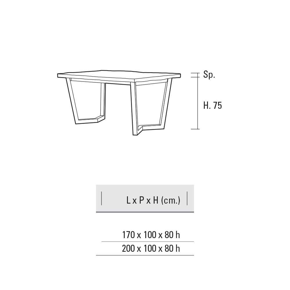 Fast matbord med metallunderrede och skiva i barkat trä Tillverkat i Italien.