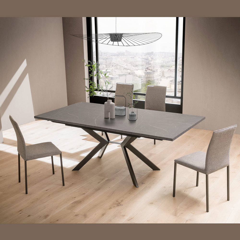 Basen, i målad metall och med en korsad geometrisk design, erbjuder stabilitet och en skulptural touch som inte går obemärkt förbi. En perfekt inredningslösning för matsalar, öppna ytor eller kontraktsmiljöer med en raffinerad stil.
