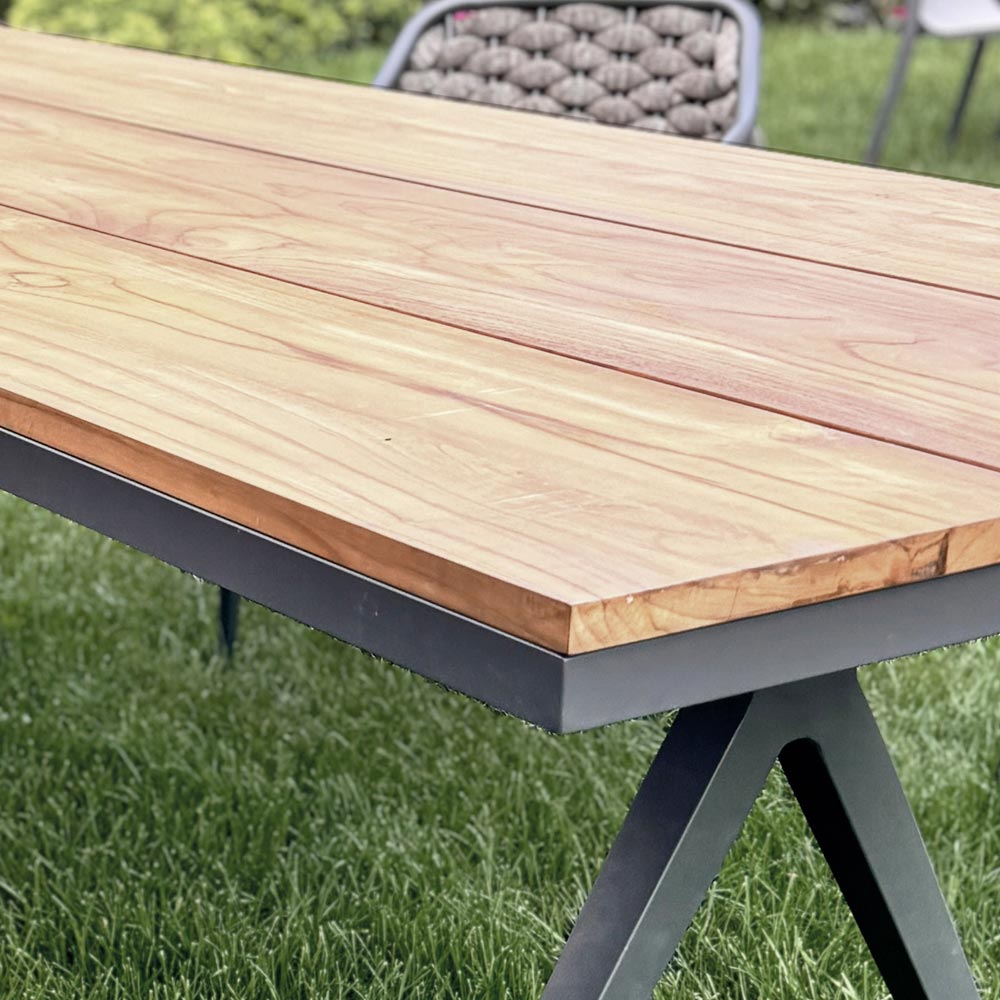 Den verkliga huvudpersonen är toppen i massiva teakribbor , ett urval av hantverksmässigt värde som ger bordet en tidlös elegans. Teak, känd för sina extraordinära egenskaper av motståndskraft och hållbarhet , ger bordet en varm och välkomnande look, perfekt för raffinerade utomhusmiljöer.