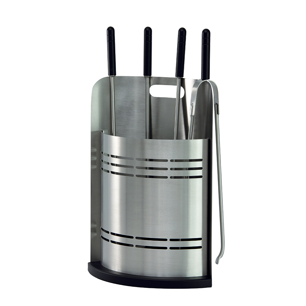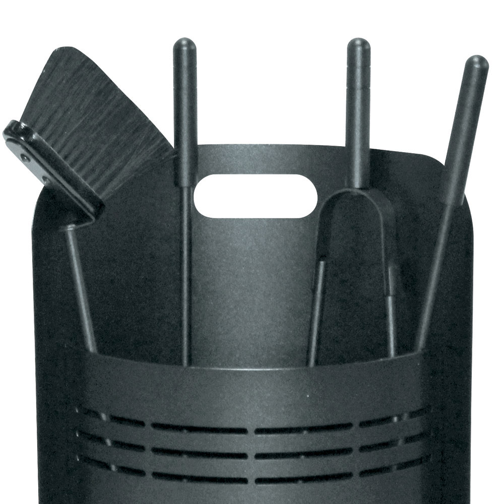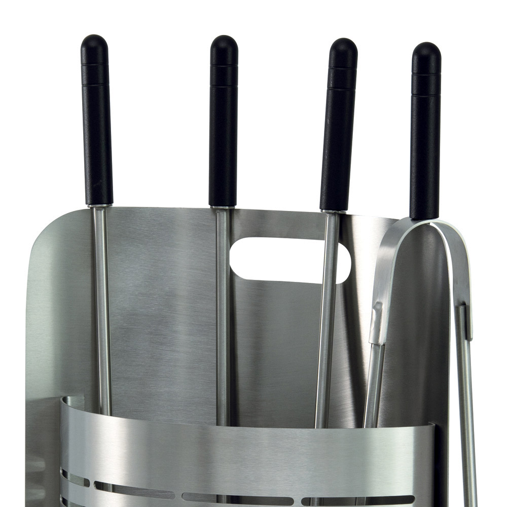 Setet innehåller 4 tillbehör , alla viktiga för att underhålla elden och rengöra eldstaden. Närvaron av ett handtag på toppen gör att du enkelt kan lyfta hela verktygshållaren och flytta den där så önskas. Dess design är funktionell men försummar inte estetiken, med rena linjer och en solid struktur som gör den till ett hållbart och stilrent inslag i hemmet.
