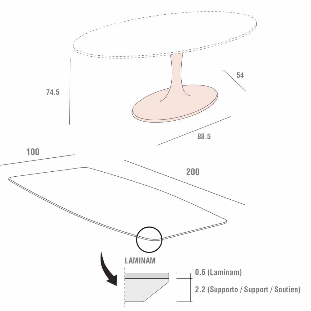 laminam (tjocklek 6 mm) utrustat med ett 22 mm stöd och bas i