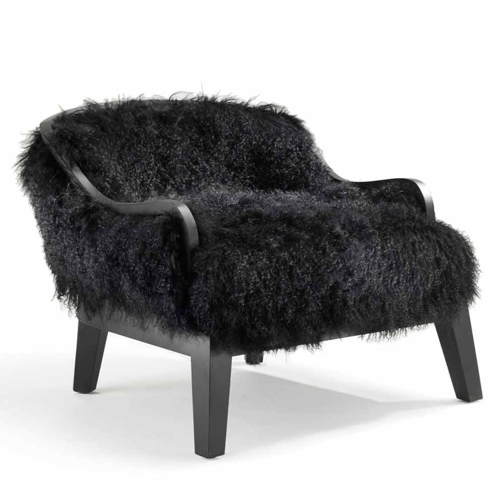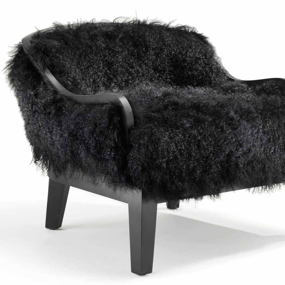 Låg fåtölj. Retro läder stoppade ryggstöd. Front sits och rygg täckt med svart tibet lamm päls. Ram och trä bas. Kom i svart ek.