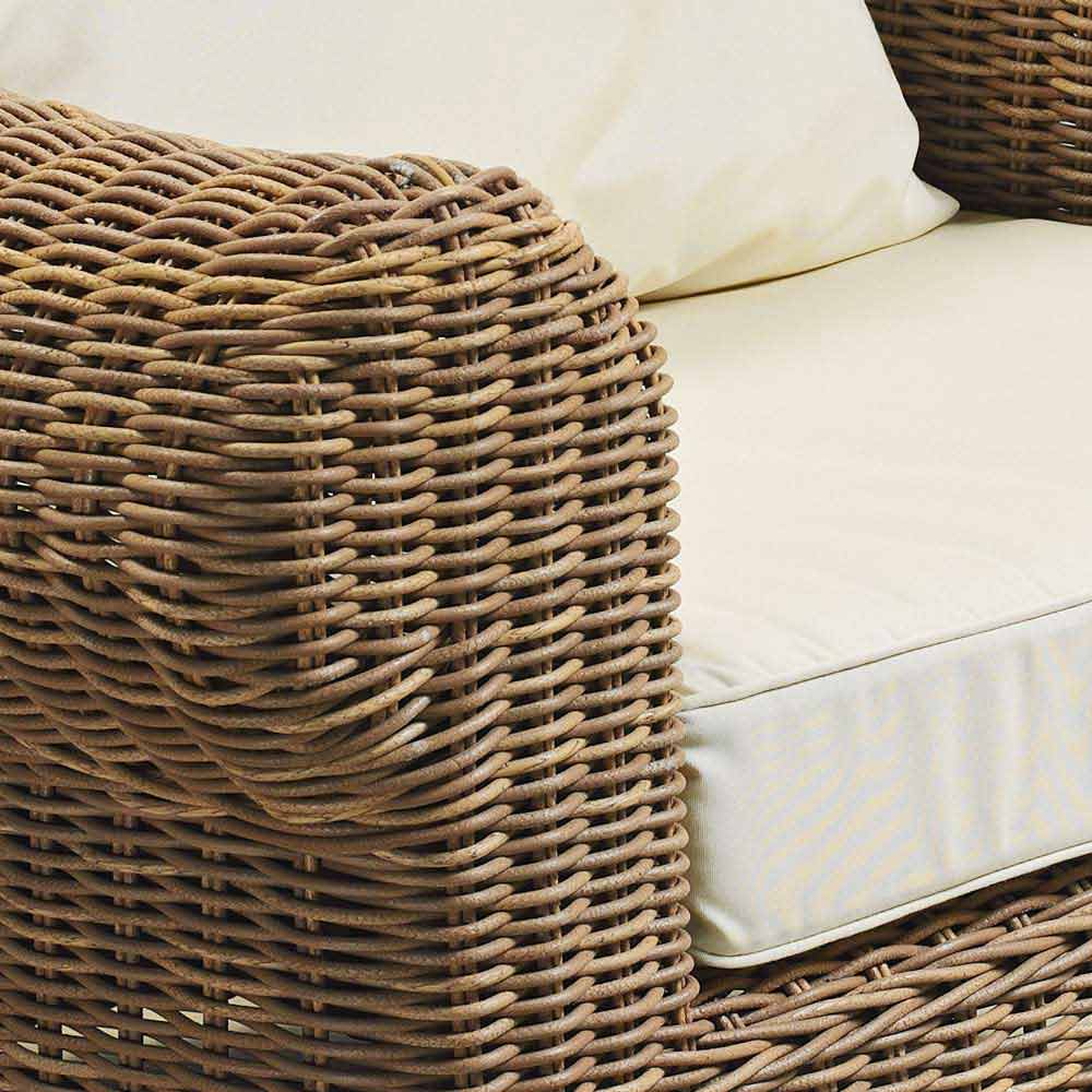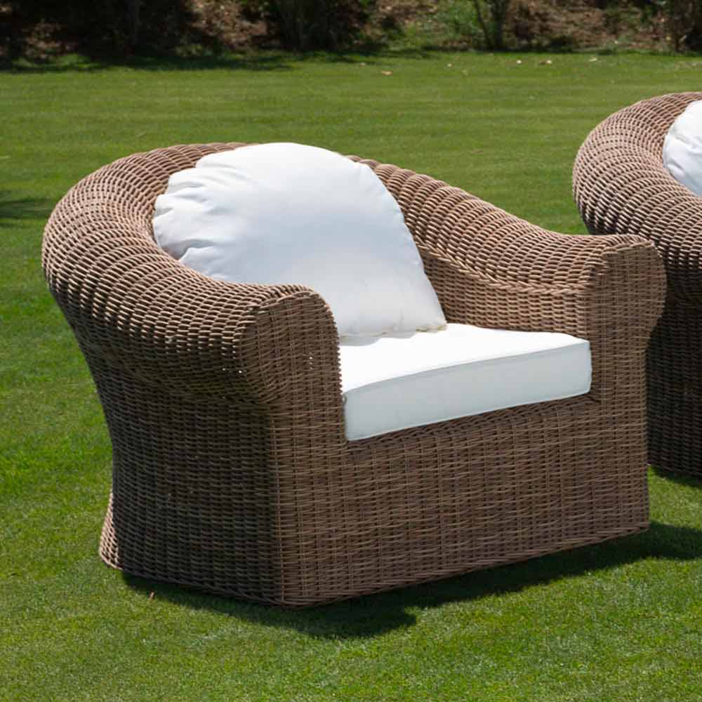 Trädgårdsfåtölj i dyrbart naturligt vävt syntetiskt rotting och vitt eller ecru-tyg.