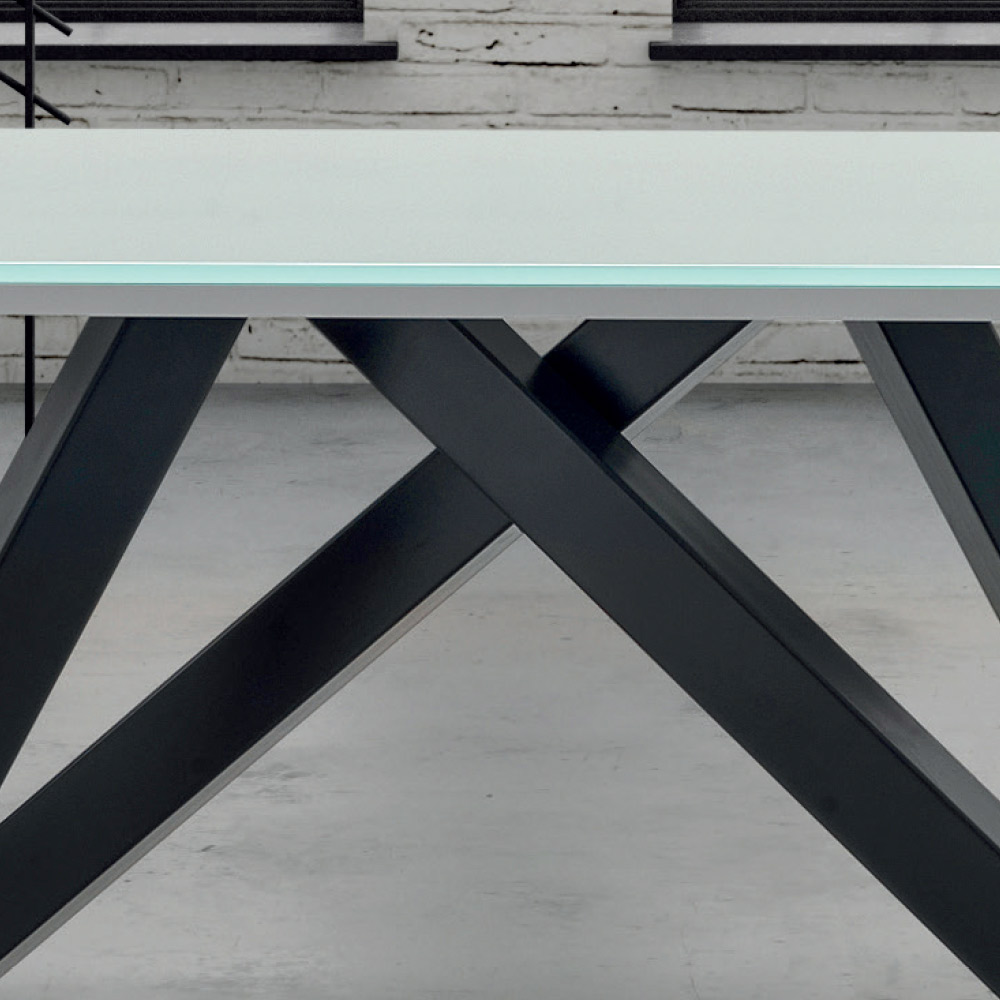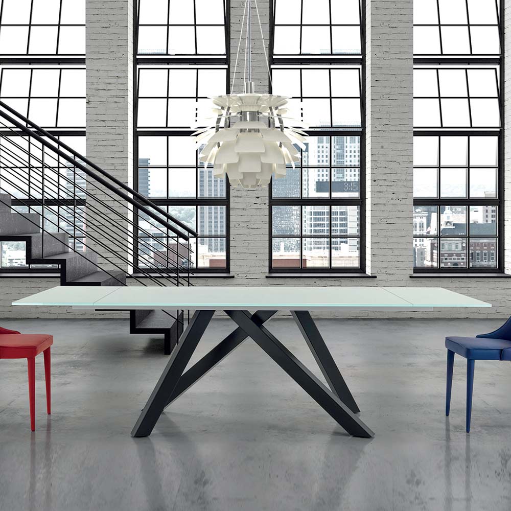 Utdragbart köksbord upp till 278 cm med glasskiva och svart stålfot tillverkat i Italien.