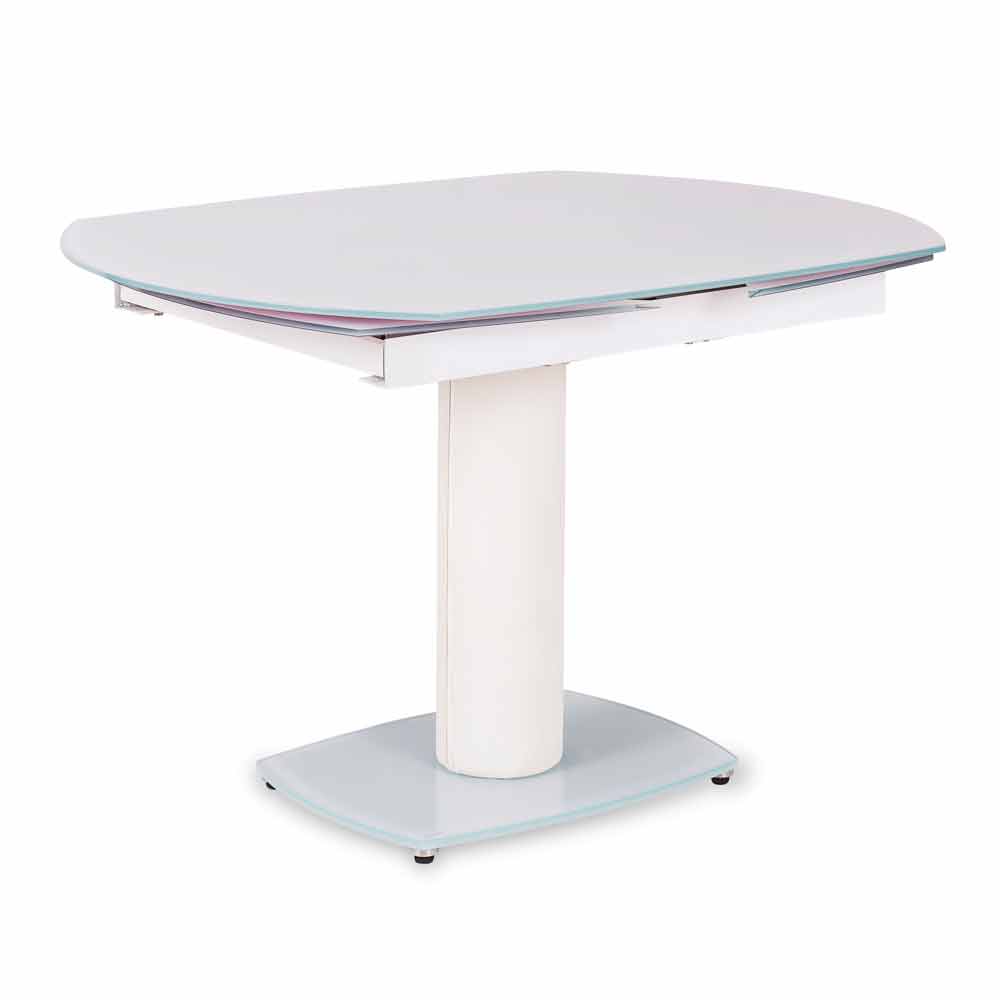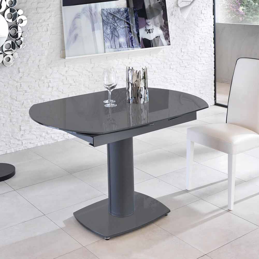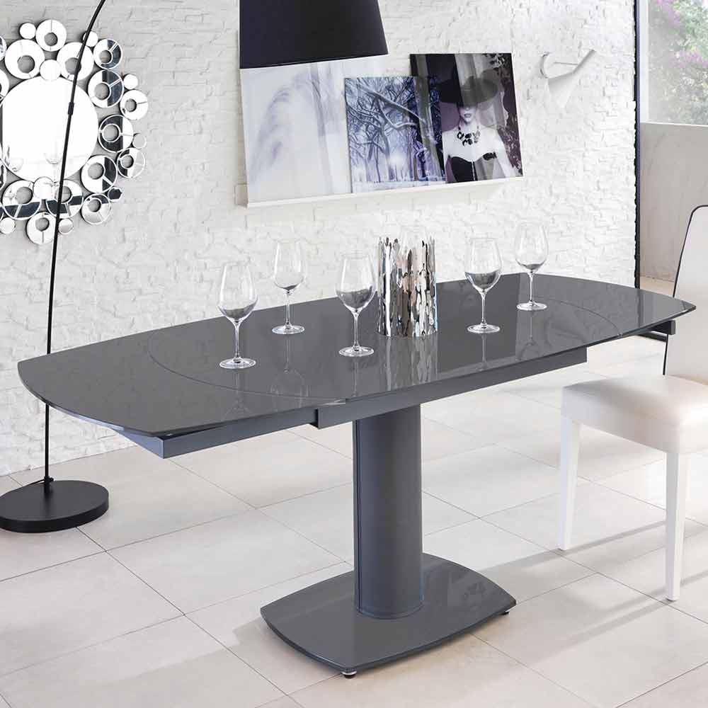 Leila är ett utdragbart bord med modern design med bas, topp och förlängningar i härdat glas. En särskiljande egenskap hos denna tabell är metallpelaren täckt av konstläder. Tack vare de praktiska förlängningarna är det möjligt att ha en 180 cm lång yta.