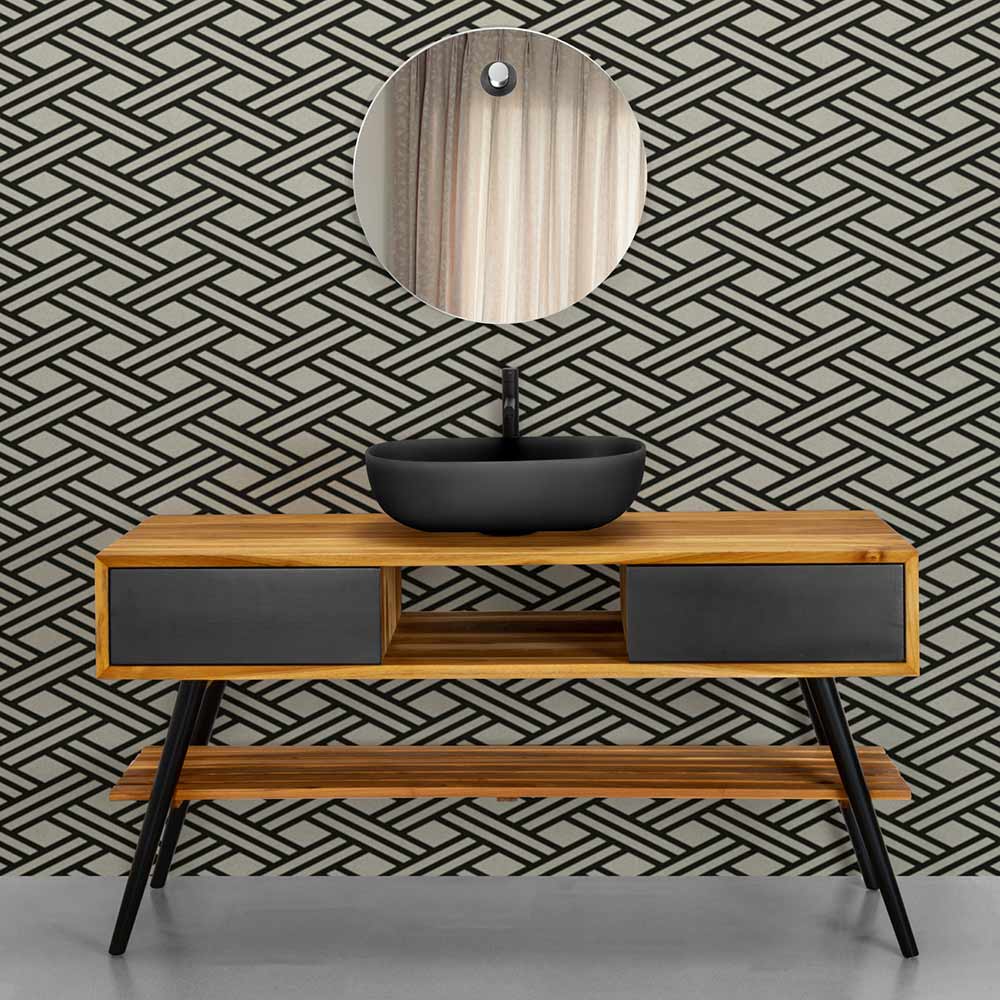 Fristående badrumsskåp med återvunnen naturlig teakstruktur berikad med 2 lådor i mattsvartmålat mahogny som matchar benen. Ett elegant och stilrent färgval som sticker ut i varje inredningssituation, vilket gör det fascinerande och mystiskt och berättar om exklusiva atmosfärer och unika känslor. En medvetet grafisk estetik som förstärks ännu mer av kombinationen av den dubbla lådan för fasaden.