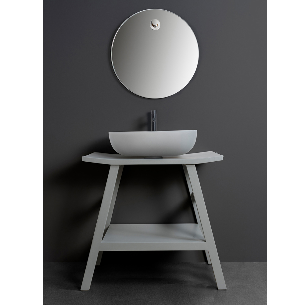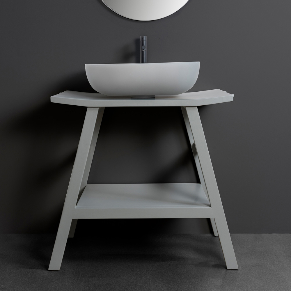 Fristående badrumsskåp i naturlig återvunnen mattgråmålad teak , en tidlös färgnyans som talar det internationella språket av elegans, vilket gör det perfekt i alla miljöer och diskret gör sig uppmärksammat. Dess struktur kännetecknas av den lätt böjda formen på toppen som ger en exklusiv och raffinerad touch till produktens estetik. Komplett med 4 praktiska handdukskrokar och funktionell förvaringshylla .