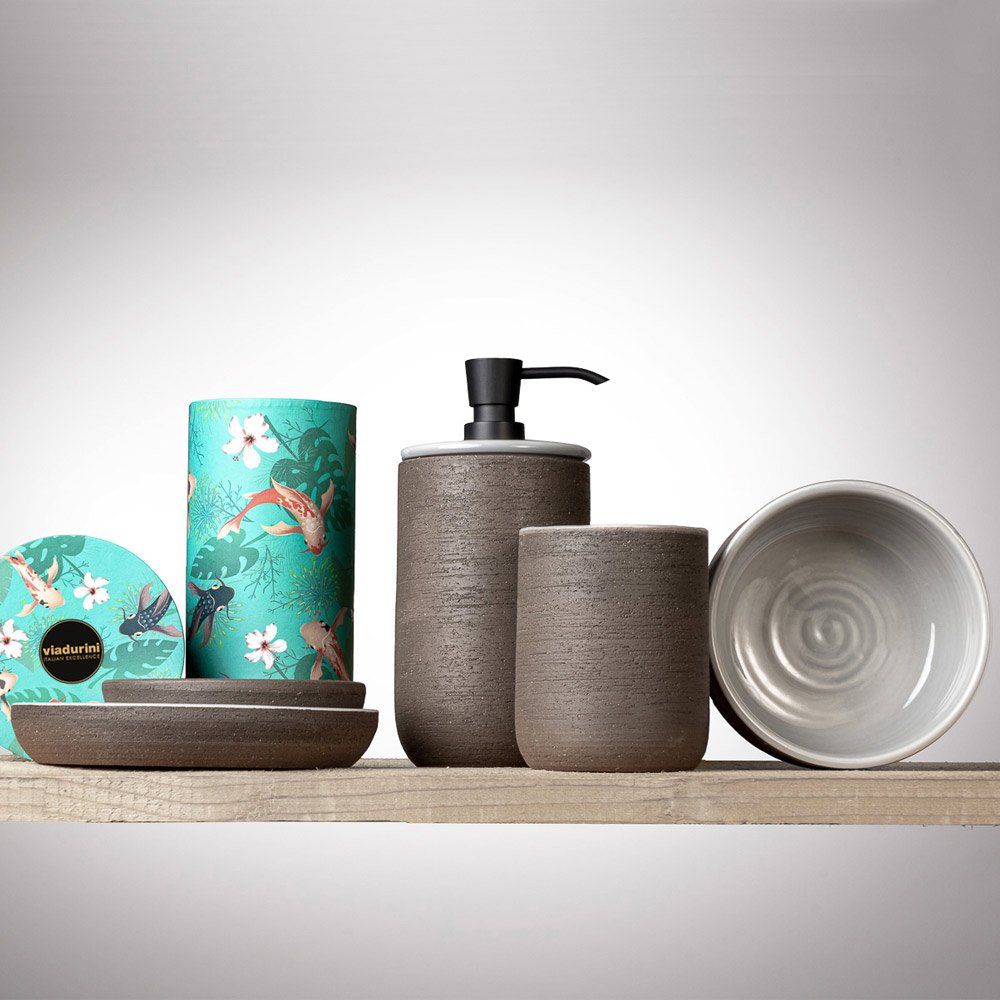 Badrumstillbehör i eldfast lera med grå inredning Made in Italy.