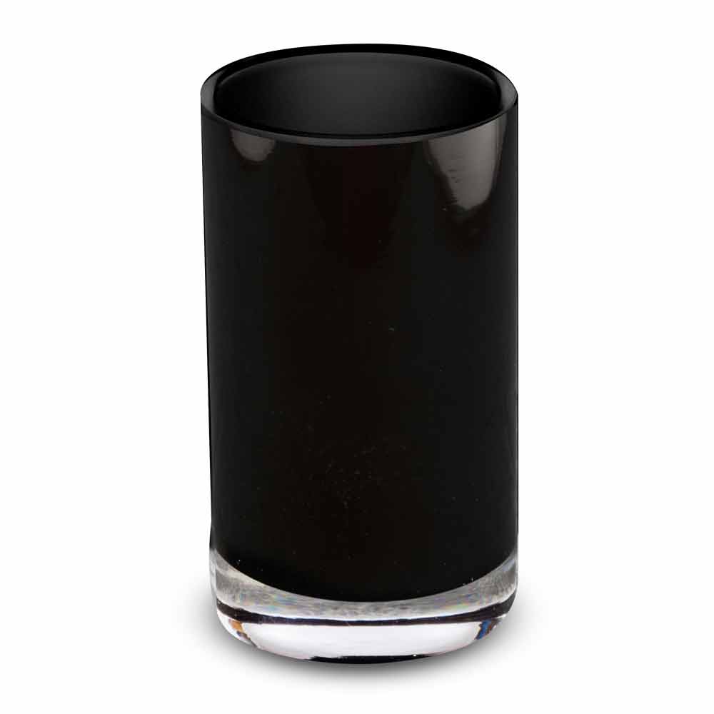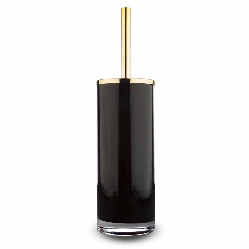 Bänkskiva badrumstillbehör i svart glas och gyllene metall.