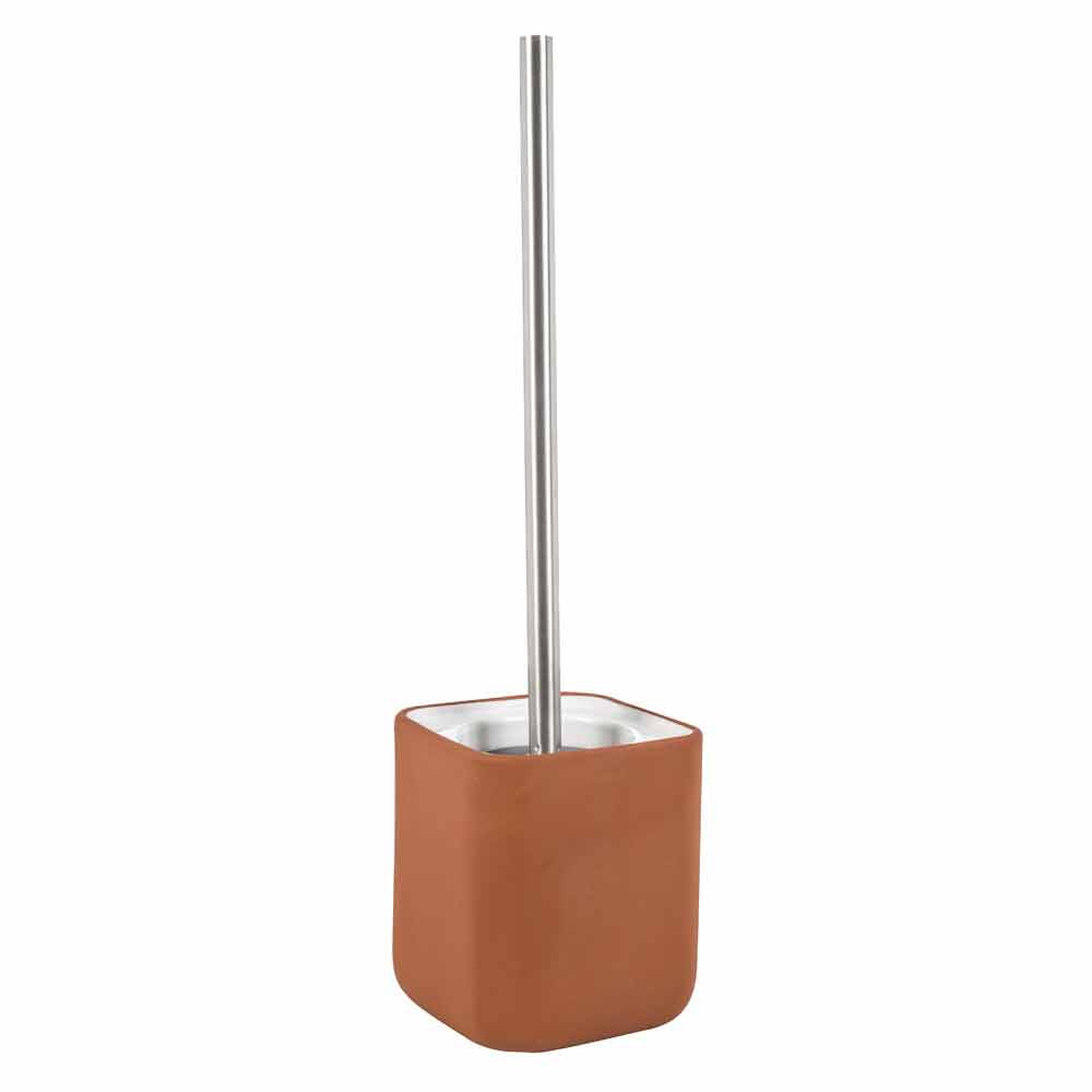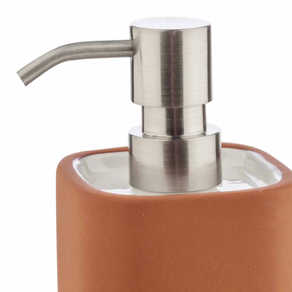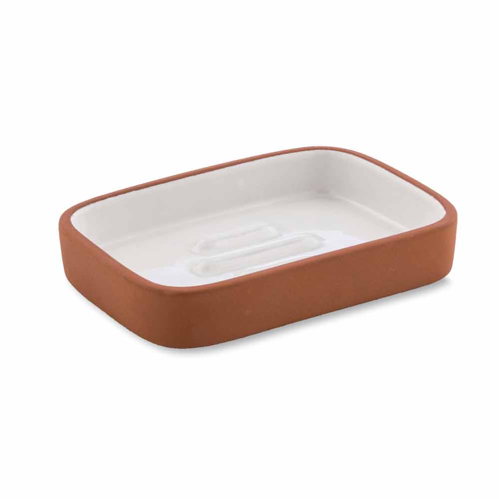 Fristående badrumstillbehör i terrakotta och glaserad keramik.