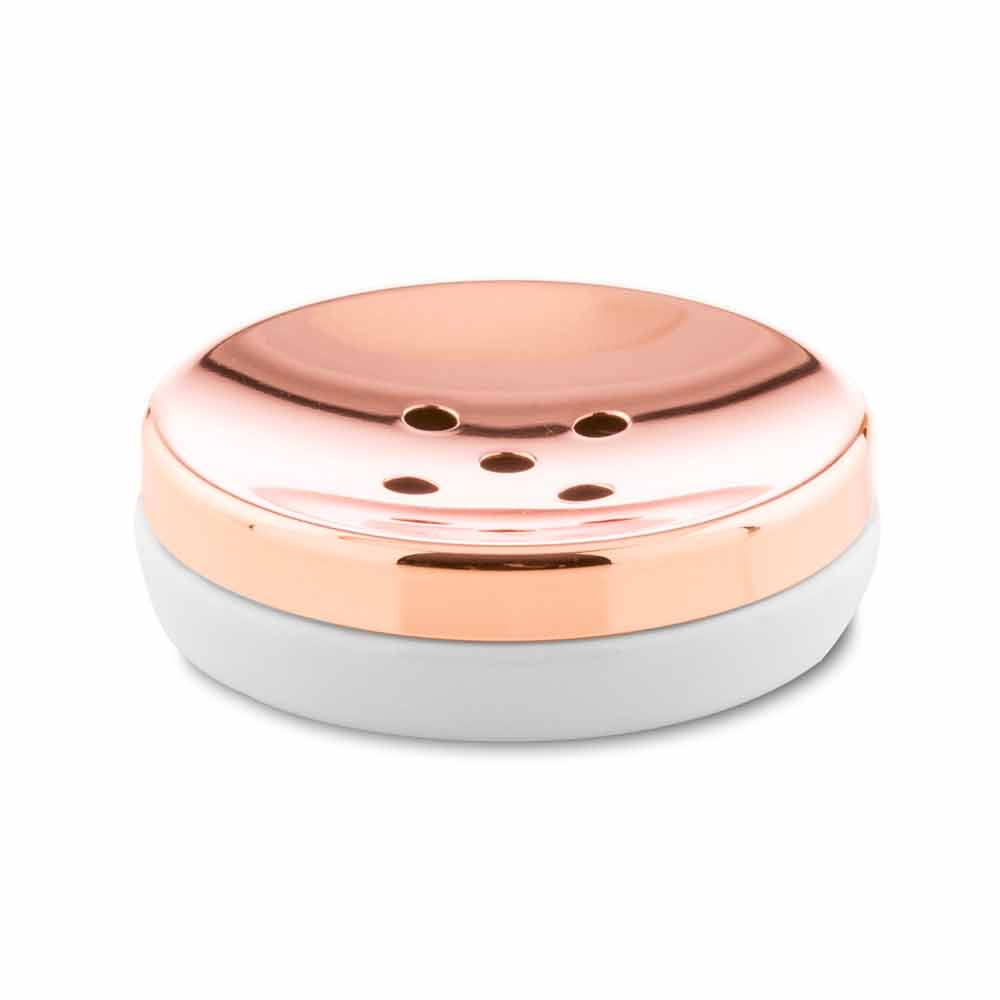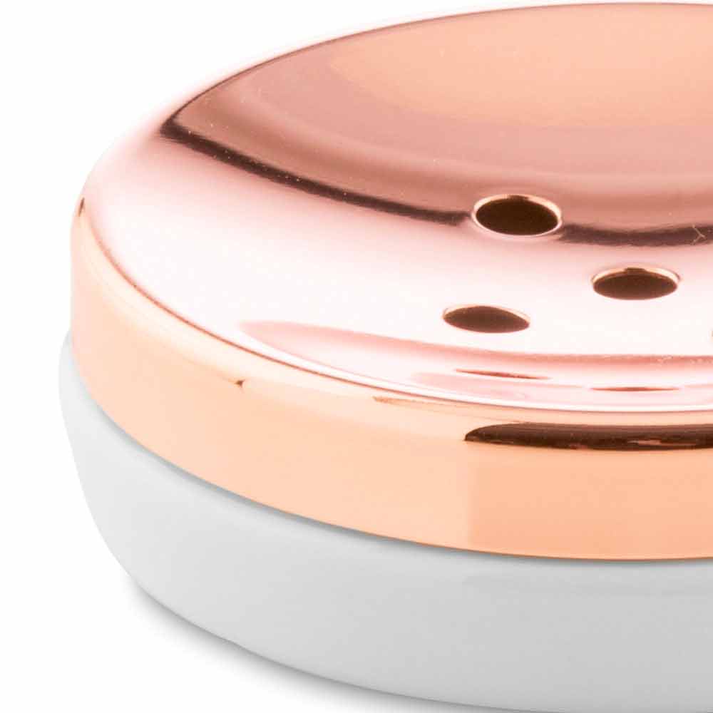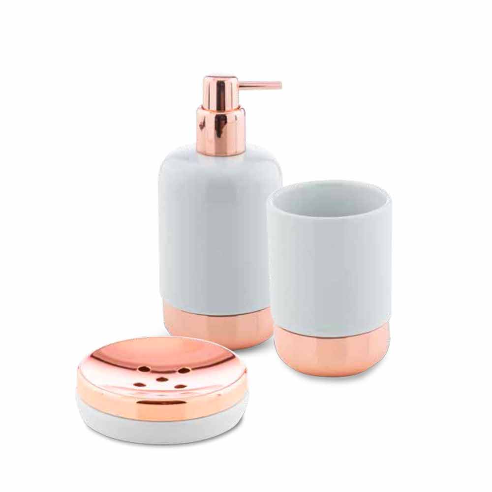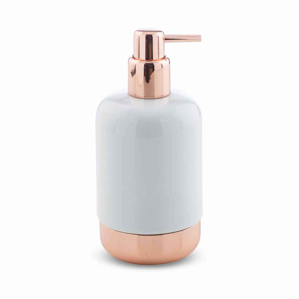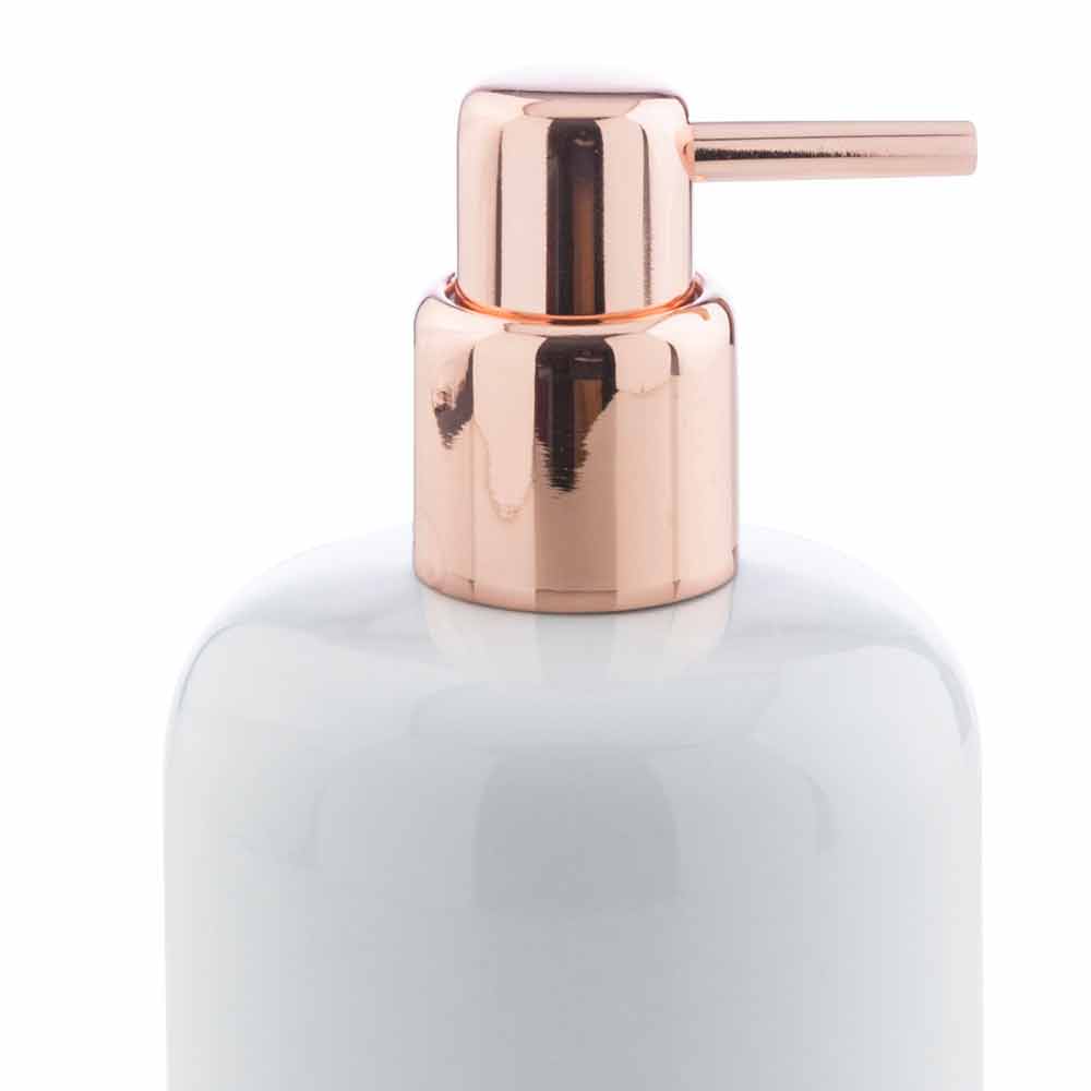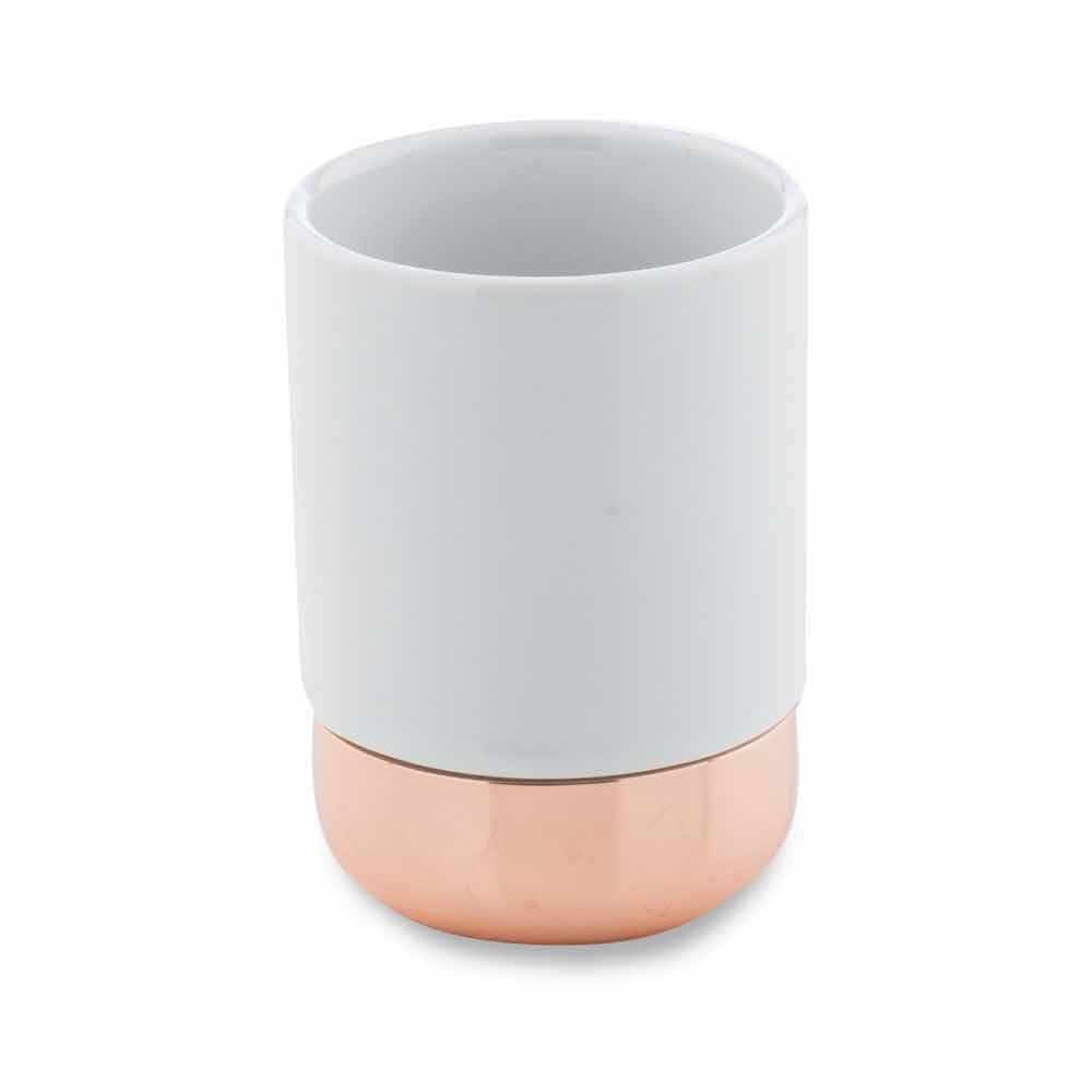Fristående badrumstillbehör gjorda av keramik och polerad koppar.