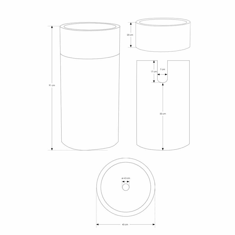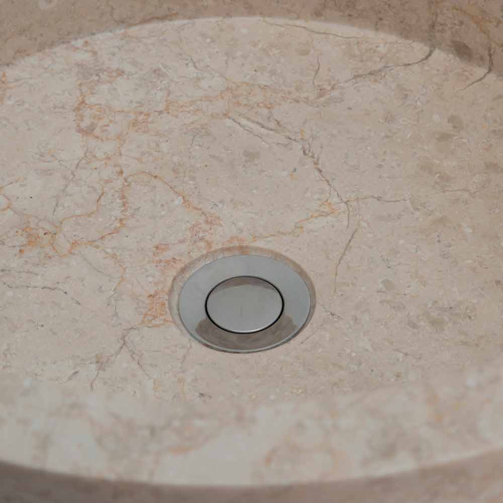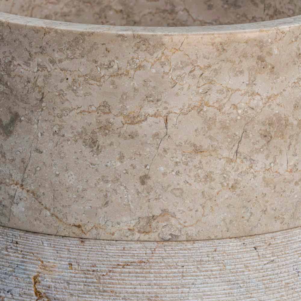 Fristående handfat i marmor i nyanser av elfenben till grädde och varma variationer. Sammansatt i två delar, den första "bassängen" är i polerad marmor både utvändigt och invändigt. Den andra delen är "basen" gjord genom att dekorera den råa marmorn med en vändningseffekt. Den typ av bearbetning som används för basen kan skapa sprickor eller sprickor i marmorn som INTE Kompromissar med integriteten eller säkerheten hos diskbänken på något sätt. Sådana situationer betraktas inte som produktfel.