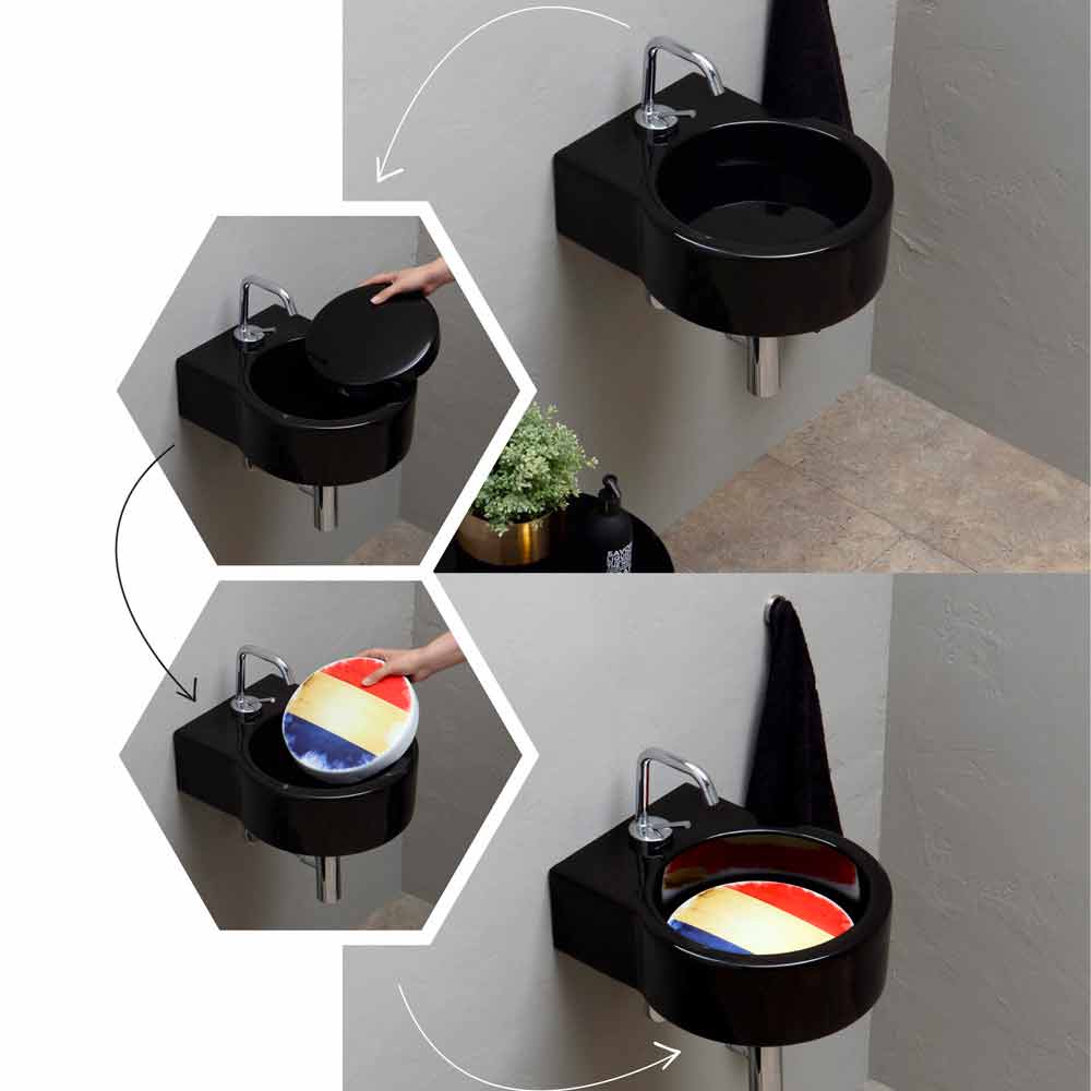 Det säregna är att det är ett handfat med kontinuerligt flödesvatten, med möjlighet att installeras som stöd eller upphängas.