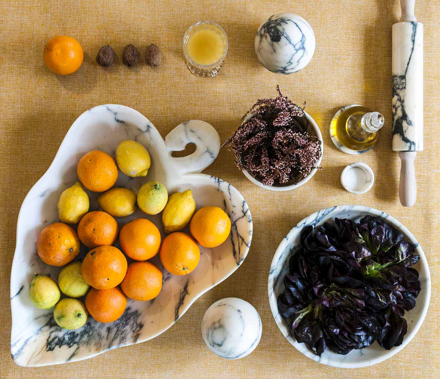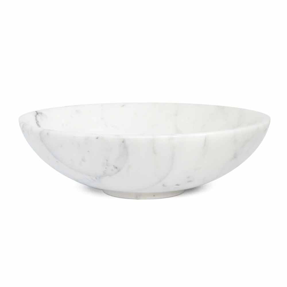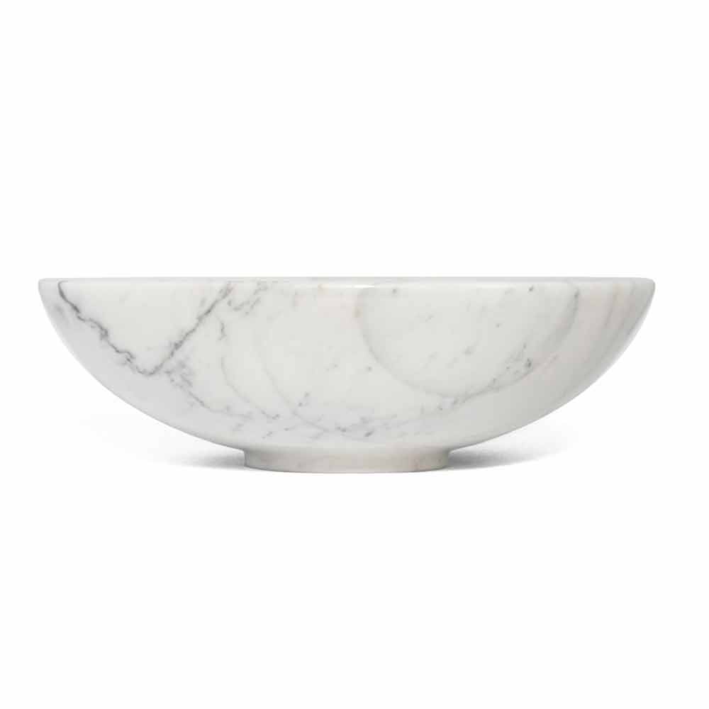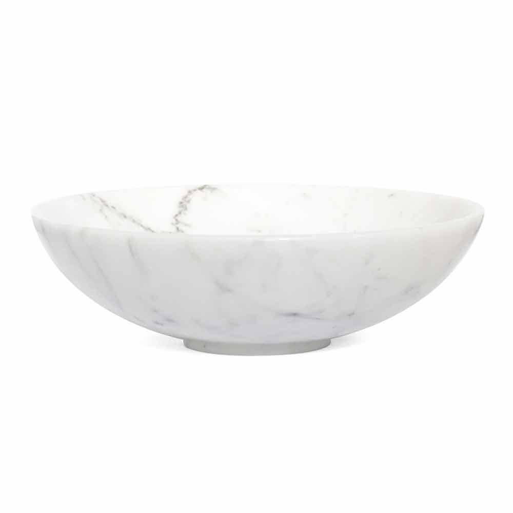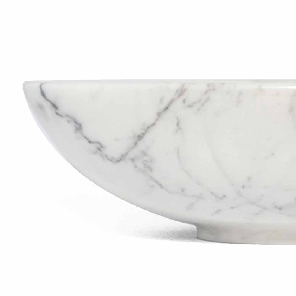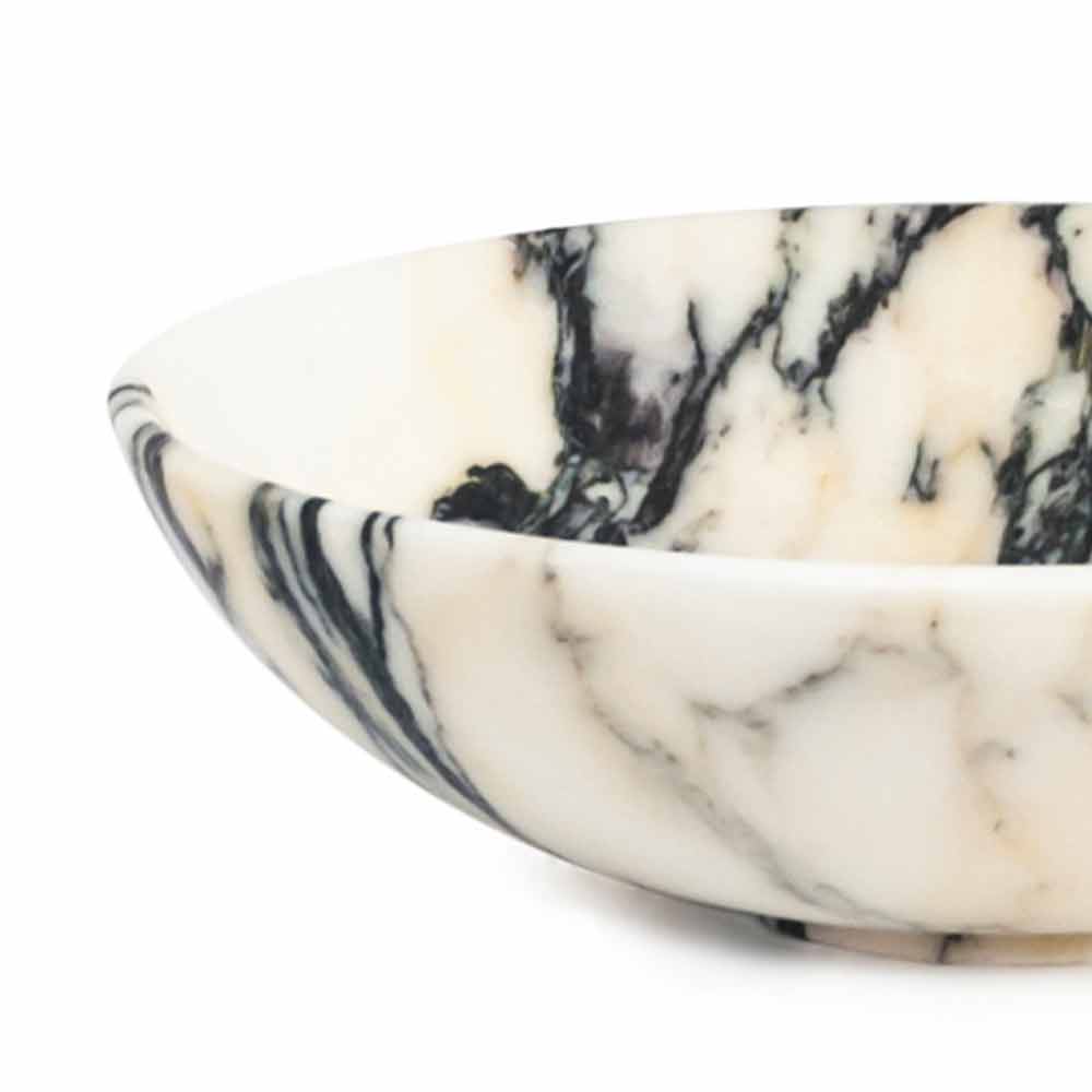 Rund fruktskål kännetecknad av ädel marmor med vilken den är handgjord av specialiserade proffs. Det är en unik bit eftersom varje block av marmor skiljer sig från de andra för vener och nyanser.