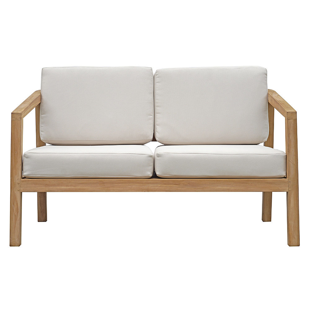 Den grundläggande och harmoniska designen framhäver träets struktur, medan de stora och bekväma sitsarna i ecrufärgat tyg gör denna möbel idealisk för att njuta av stunder av ren avkoppling utomhus.