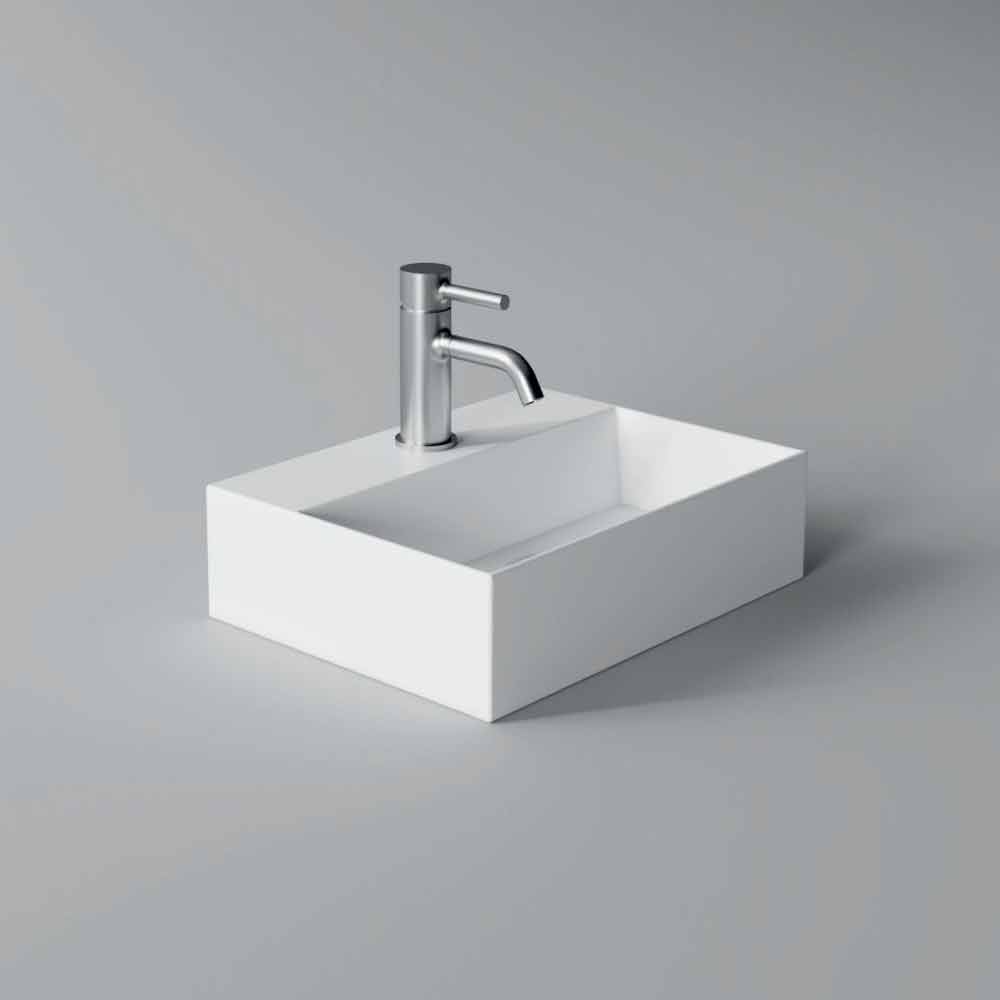 Modern design tvättställ i vit eller färgad keramik, för bänkskiva eller hängande montering. Spela teater.