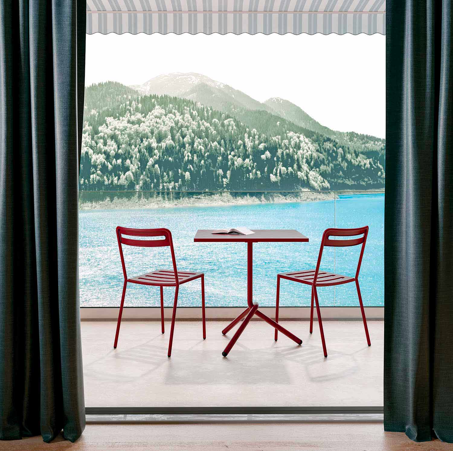Utomhus fyrkantigt soffbord i metall och stapelbar och hopfällbar plåt tillverkad i Italien.