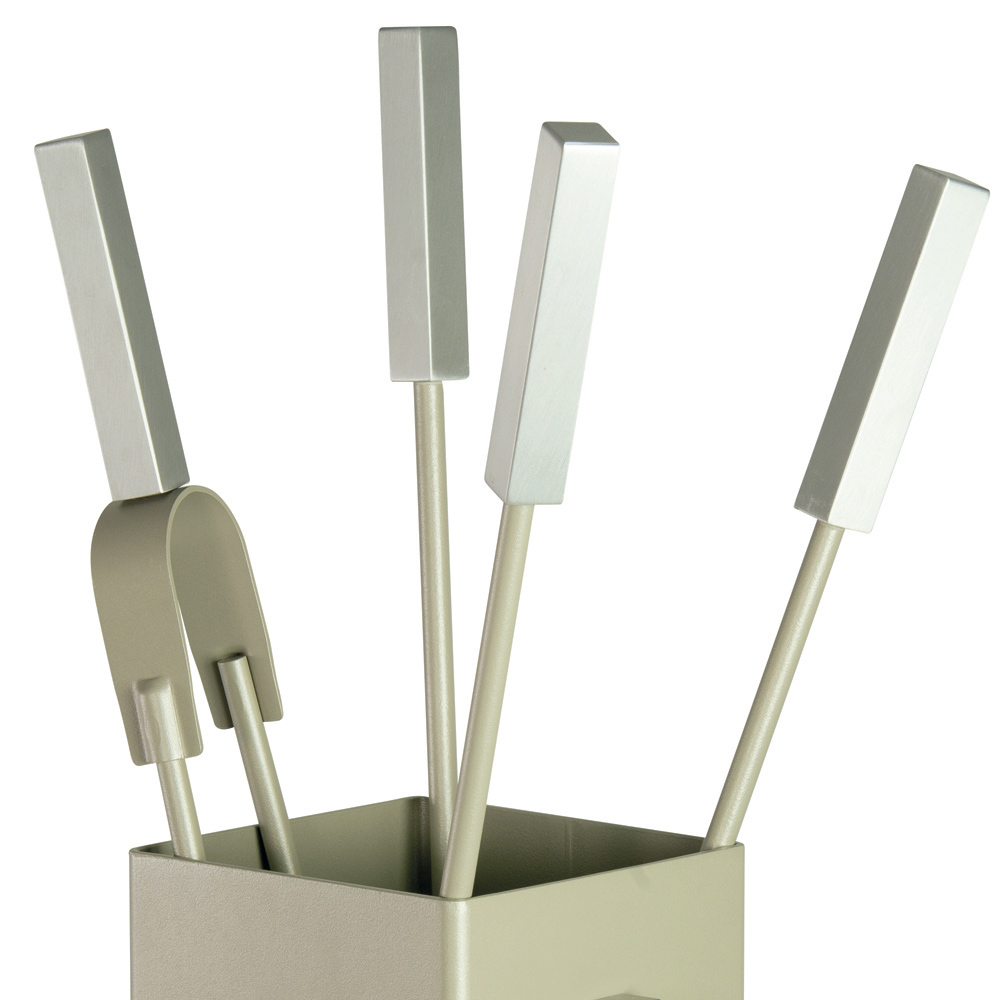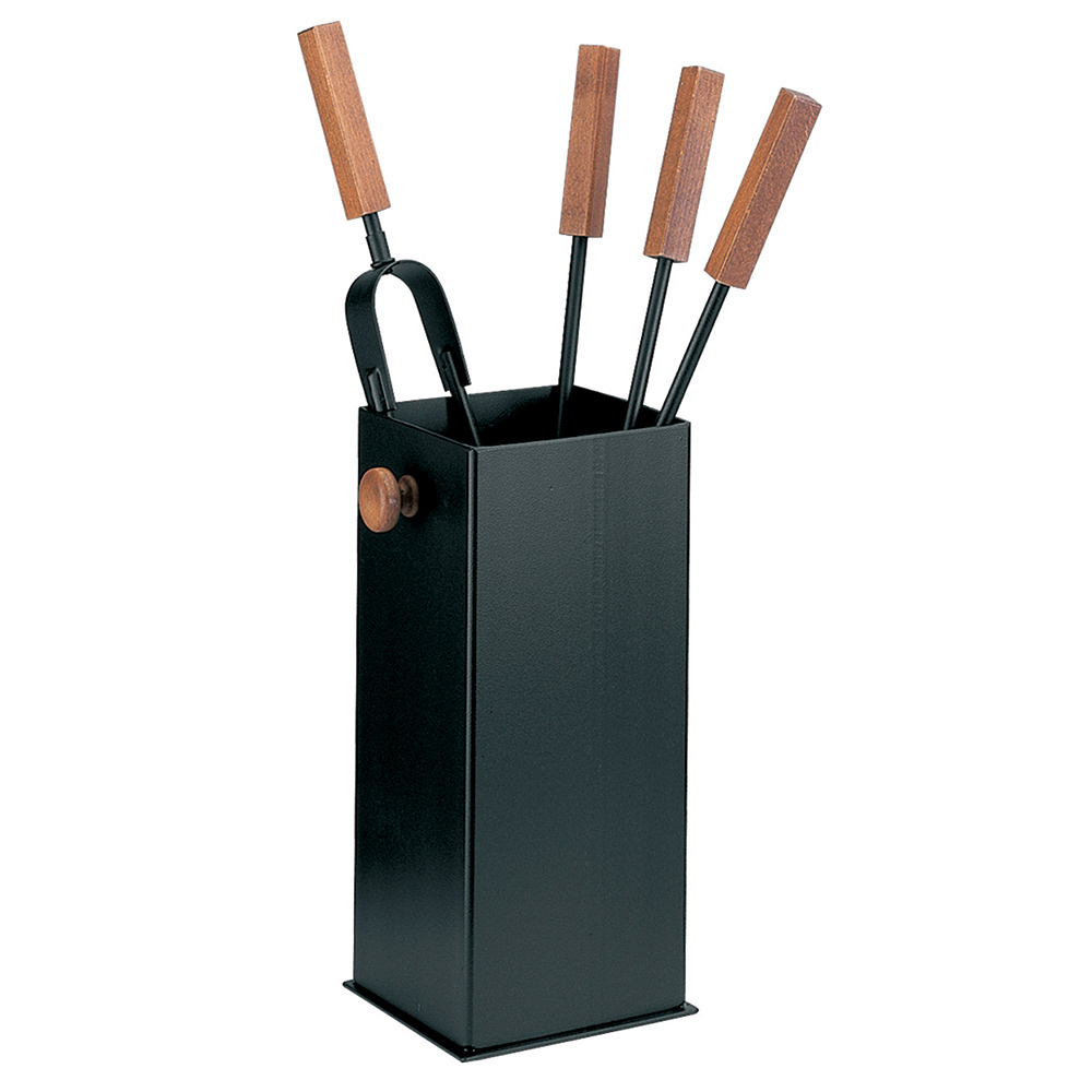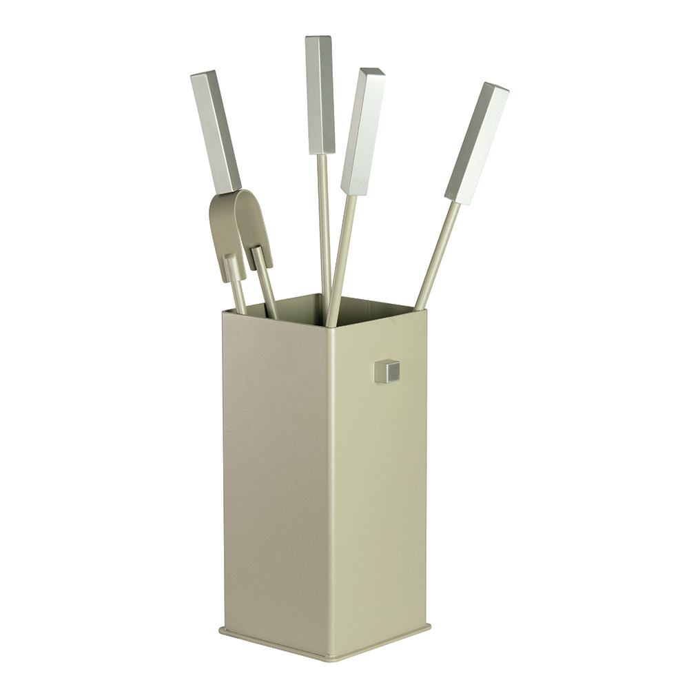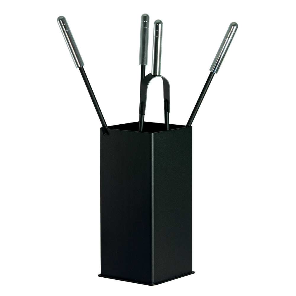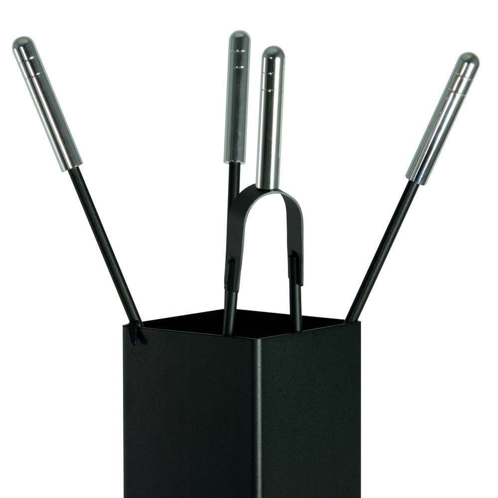 Setet innehåller allt du behöver för att hålla din eld mysig och säker. Handtagen ger ett säkert och bekvämt grepp . Stativets kompakta design gör att det kan placeras i vilket hörn som helst utan att ta upp plats, medan den förfinade knappaccenten i ansiktet ger en distinkt visuell detalj.