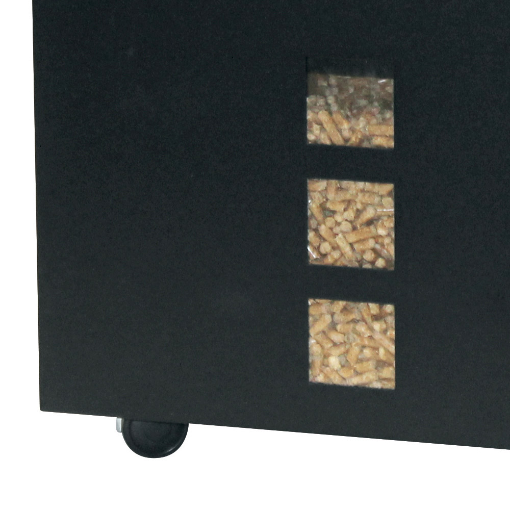 Med tydliga utrymmen som gör att du kan övervaka pelletsnivån och lägga till ett intressant visuellt element till strukturen, har denna behållare även ett topplock för enkel fyllning. Hjulen i botten garanterar behållarens rörlighet, vilket gör att du enkelt kan flytta pelletsen från ett rum till ett annat.