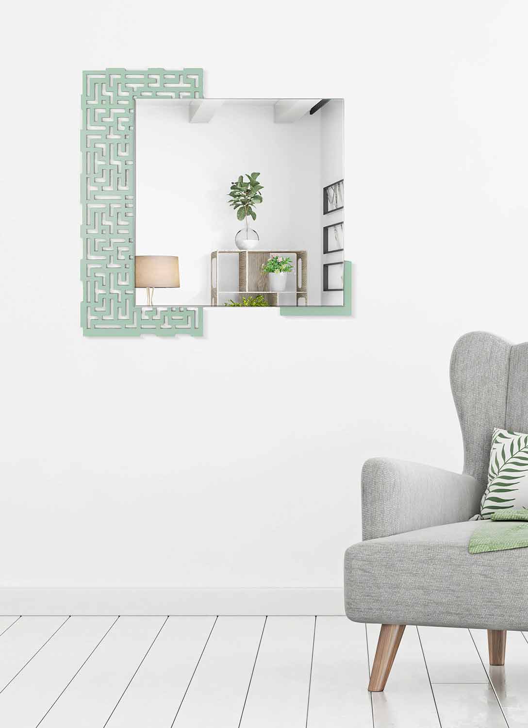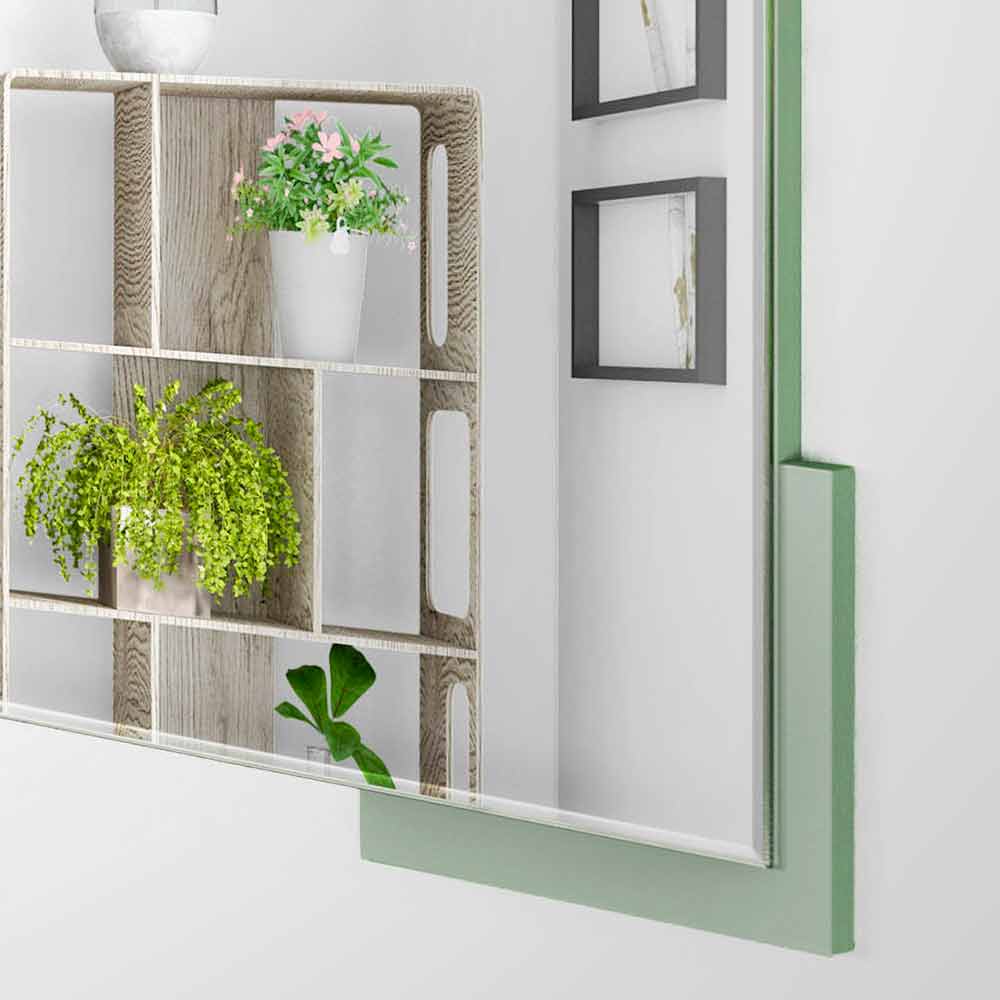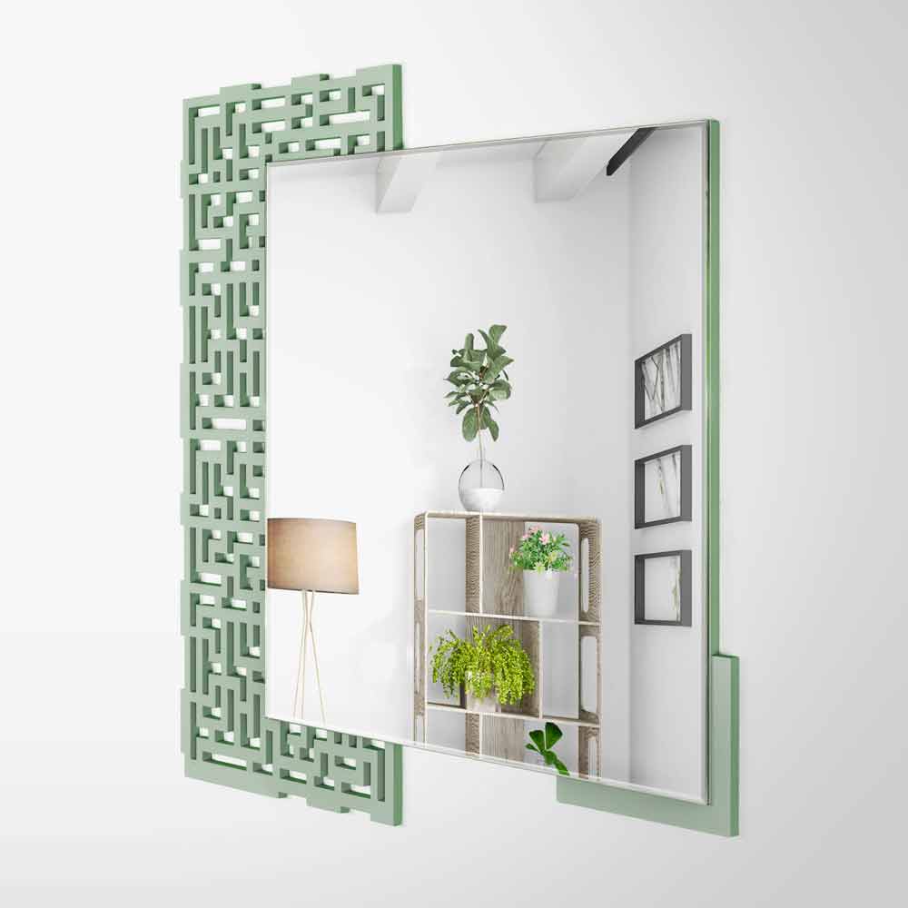 Modern väggspegel, kvadratisk geometrisk design, i grönt trä och tillverkad i Italien.