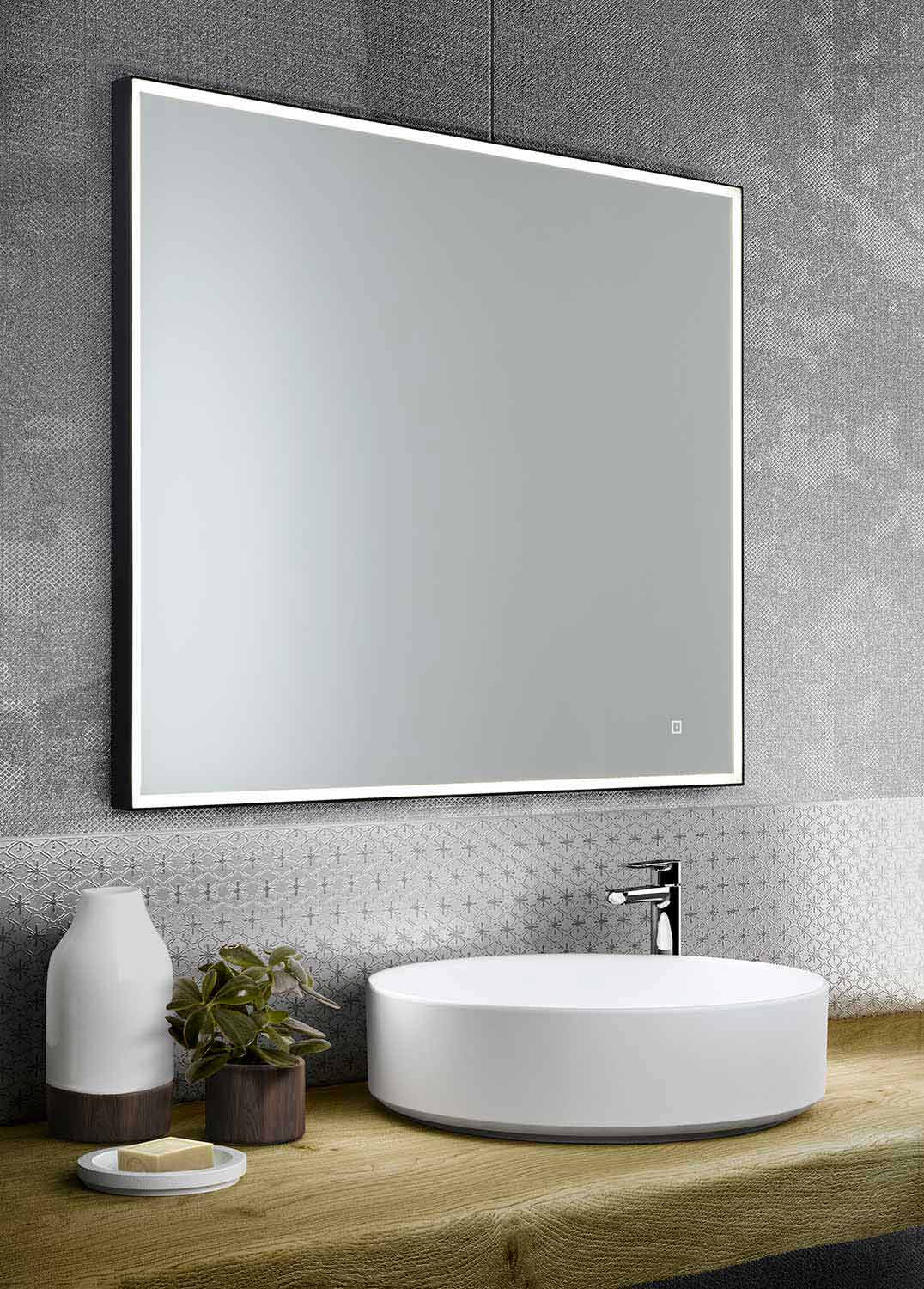 70x70 cm fyrkantig väggspegel i aluminium med LED -ljus Made in Italy.