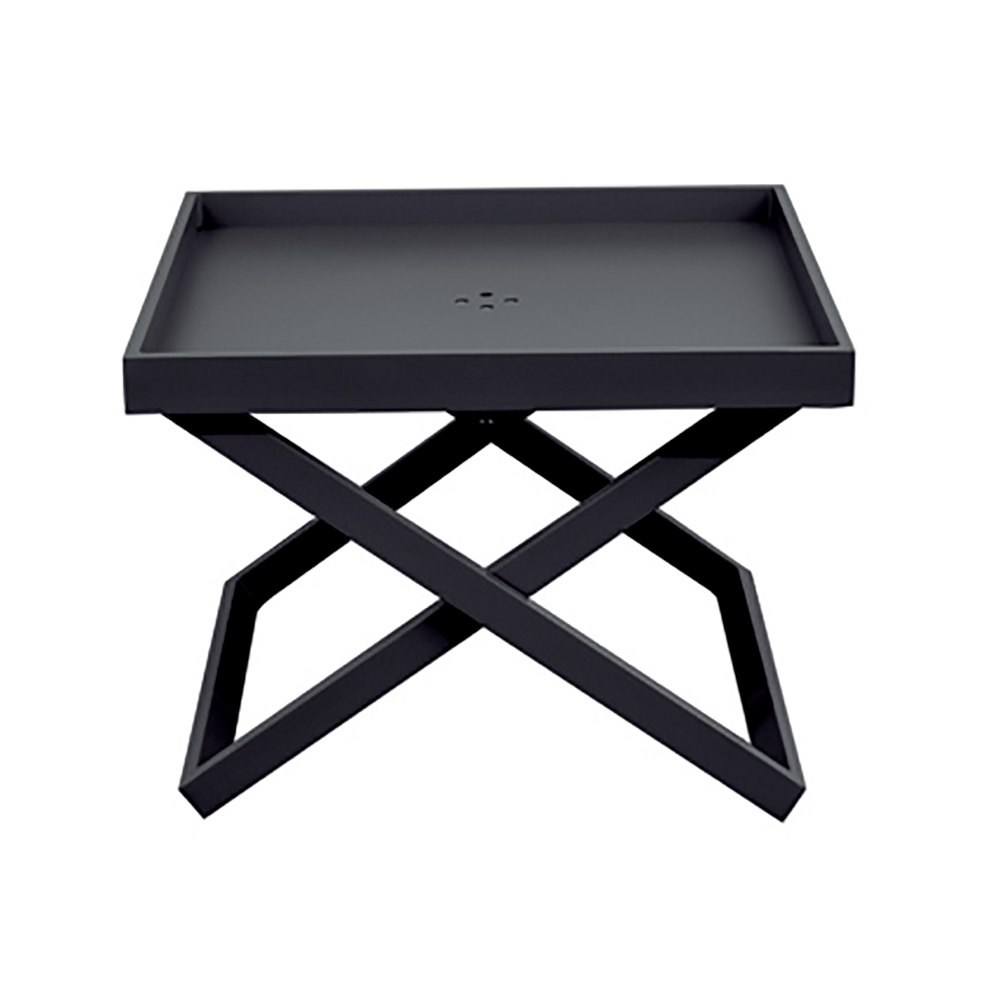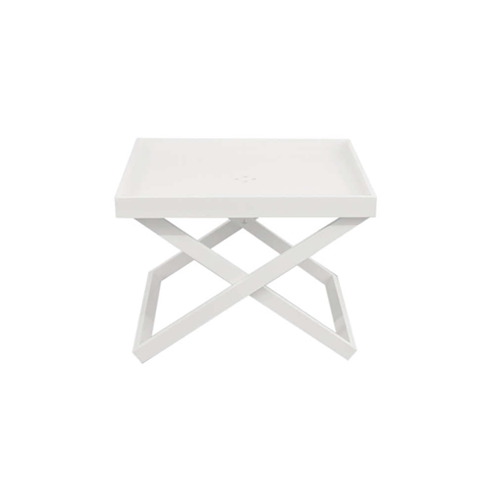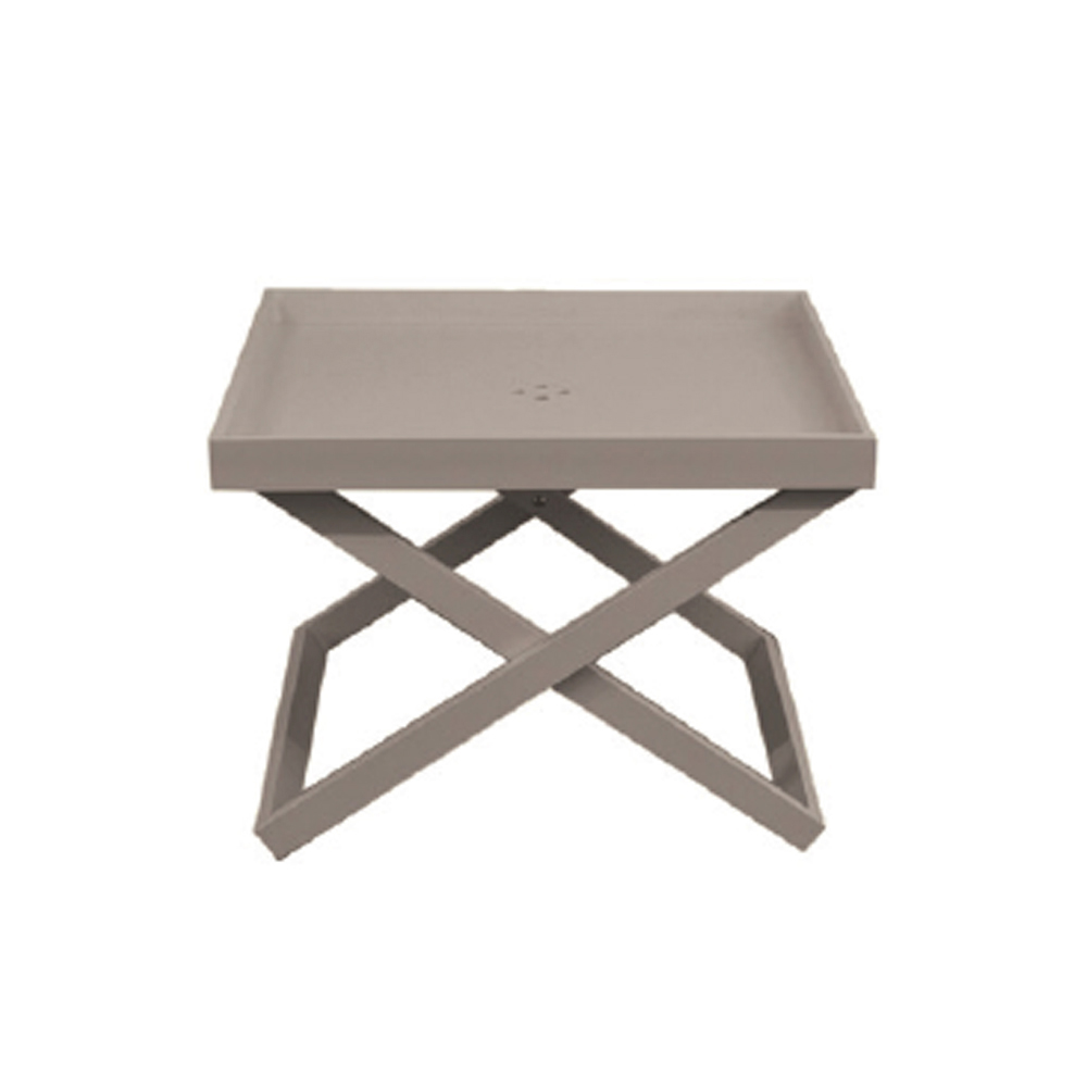 Fyrkantigt soffbord utomhus med avtagbar bricka och epoxipulverlackerad aluminiumstruktur.