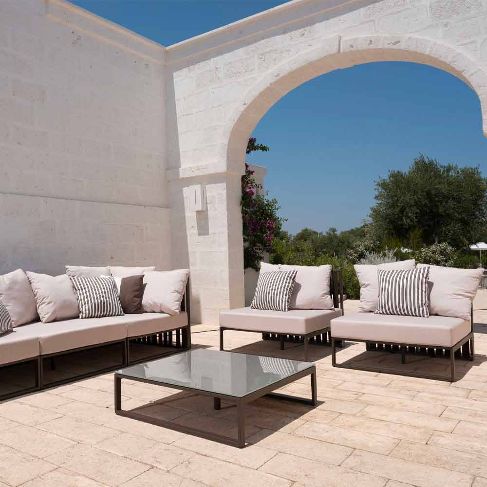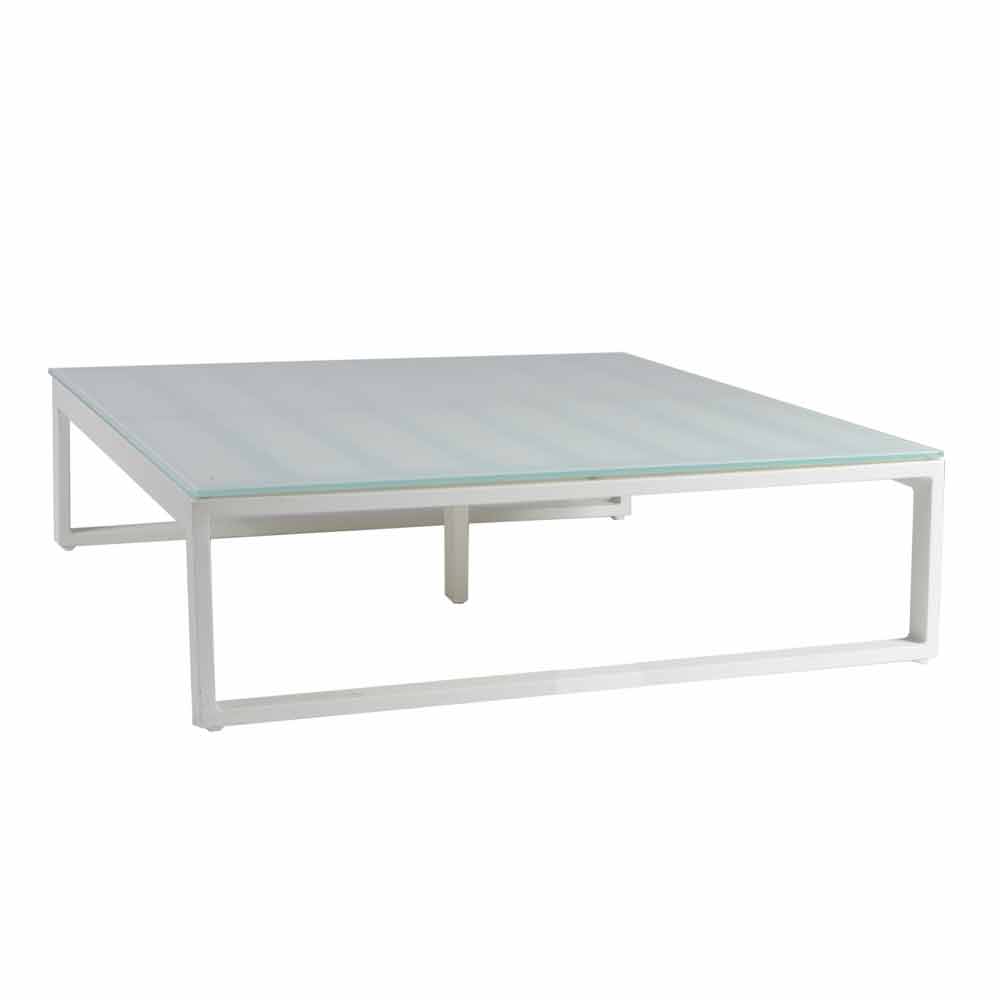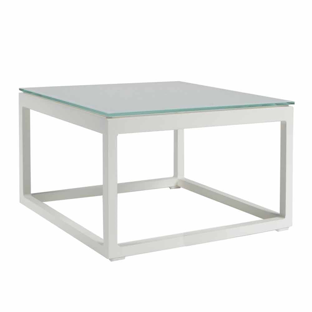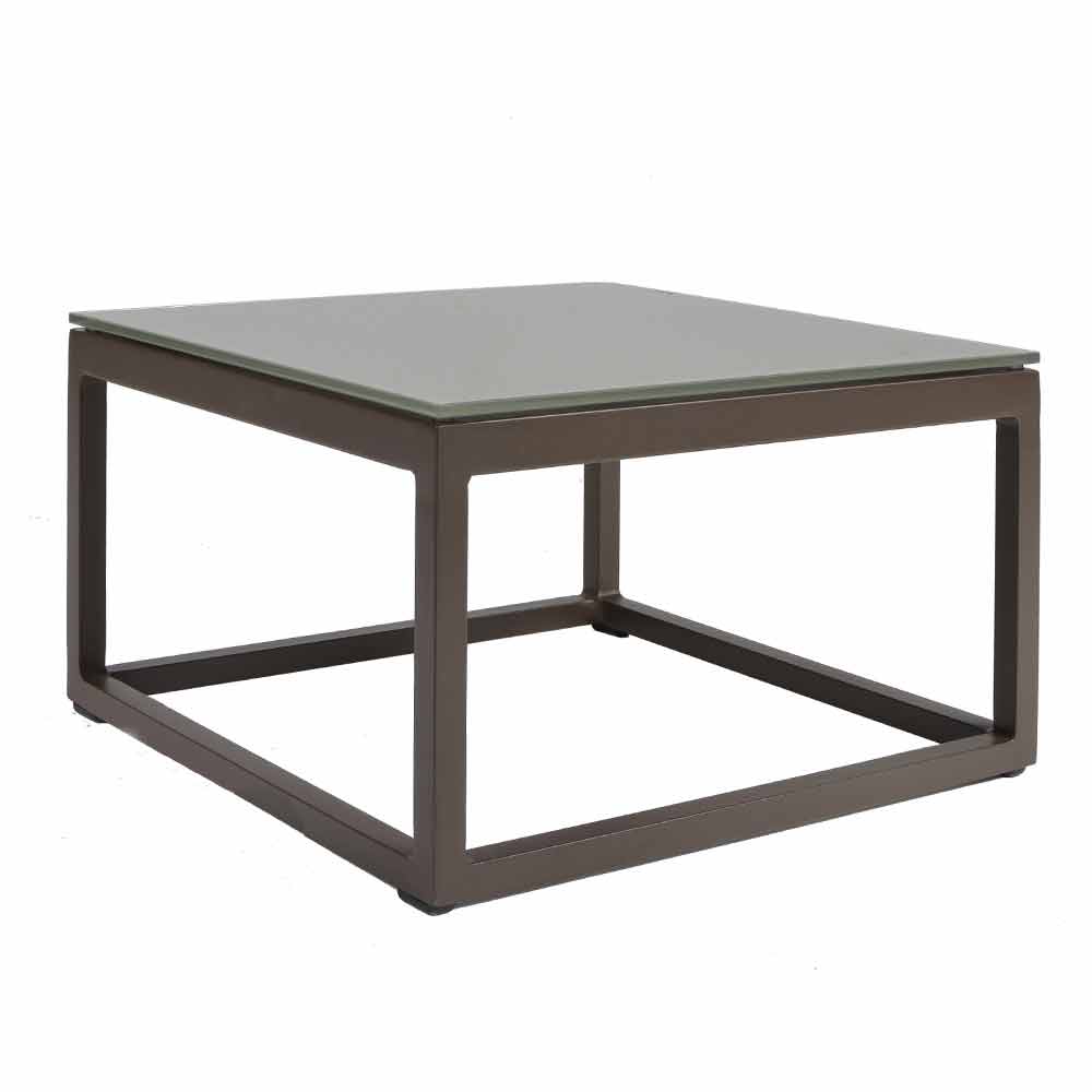 Lågt utomhusbord med aluminiumkonstruktion i tre ytor och kvadratisk glas- eller laminamskiva.