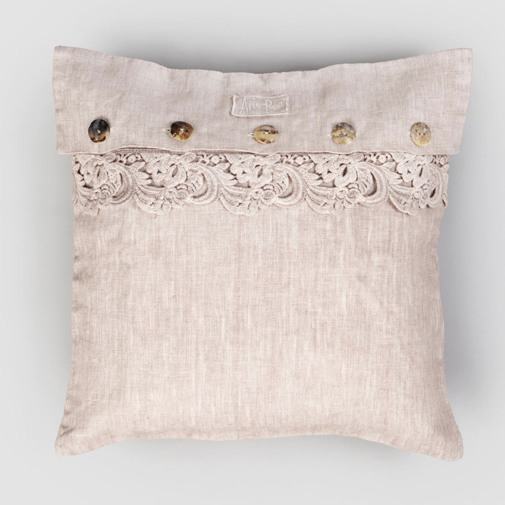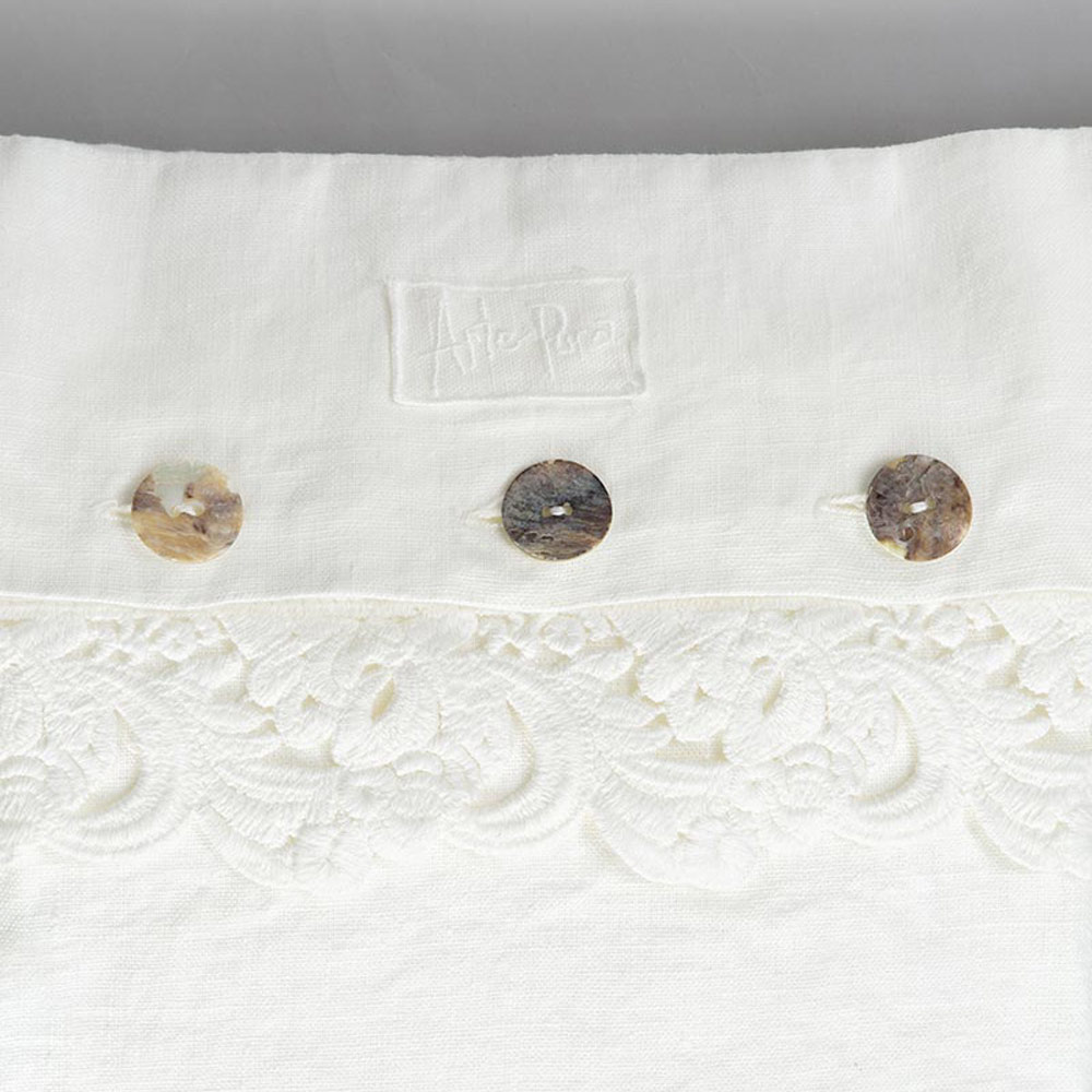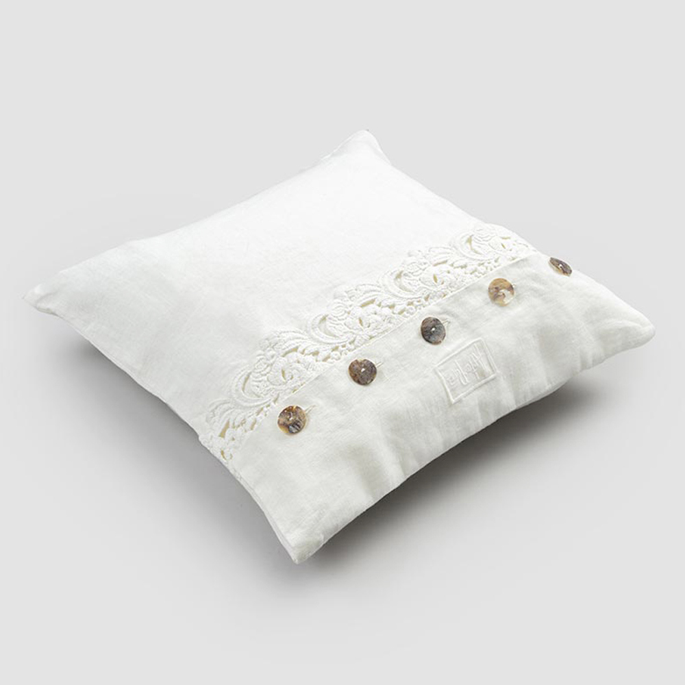 Fyrkantigt örngott i rent linne med harmonispets och knappar med lock, 2 färger tillverkade i Italien.