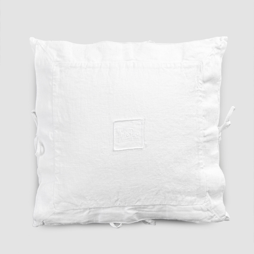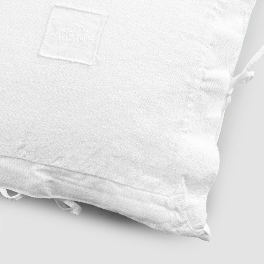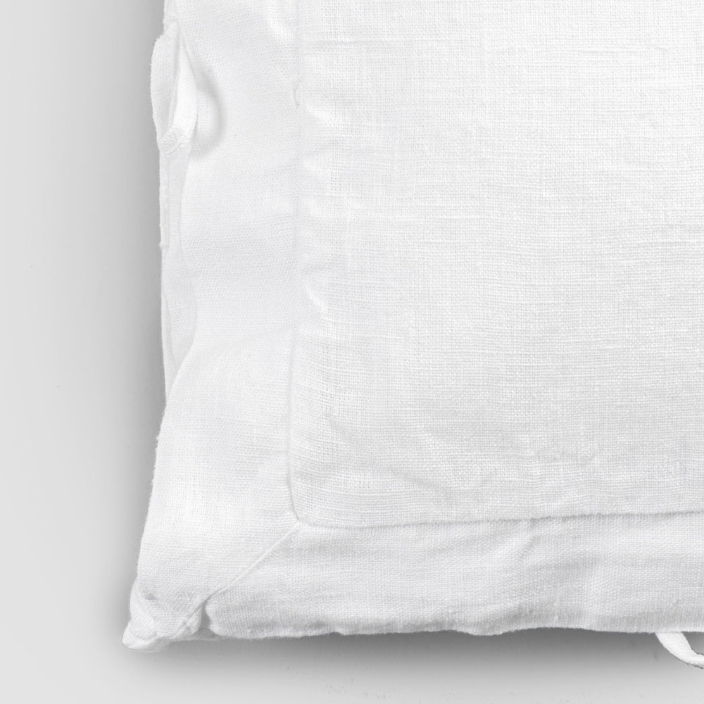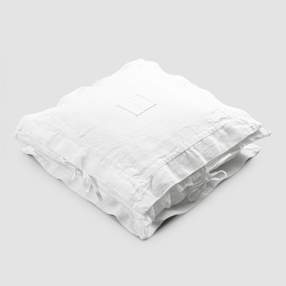 Traditionens värde ansluter sig till den moderna livsstilen med denna tunga vita linned örngott med fyrkantig dekoration och band på sidorna.
