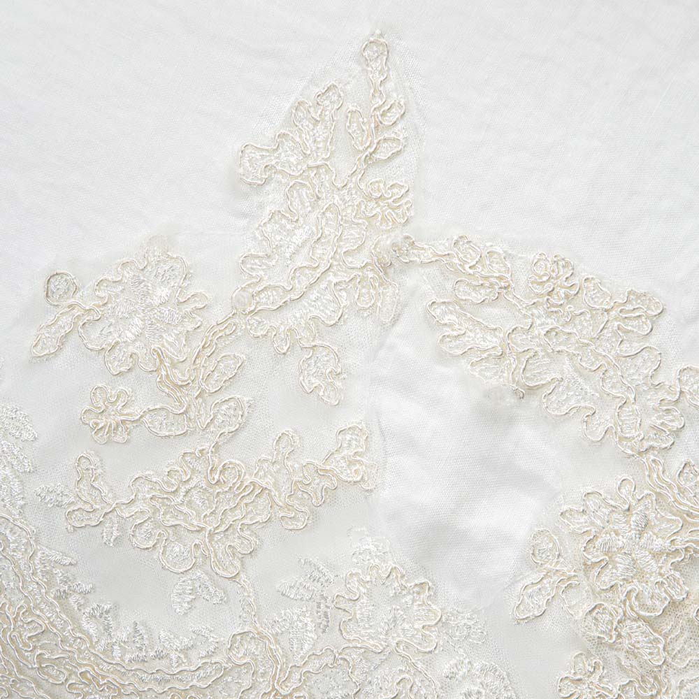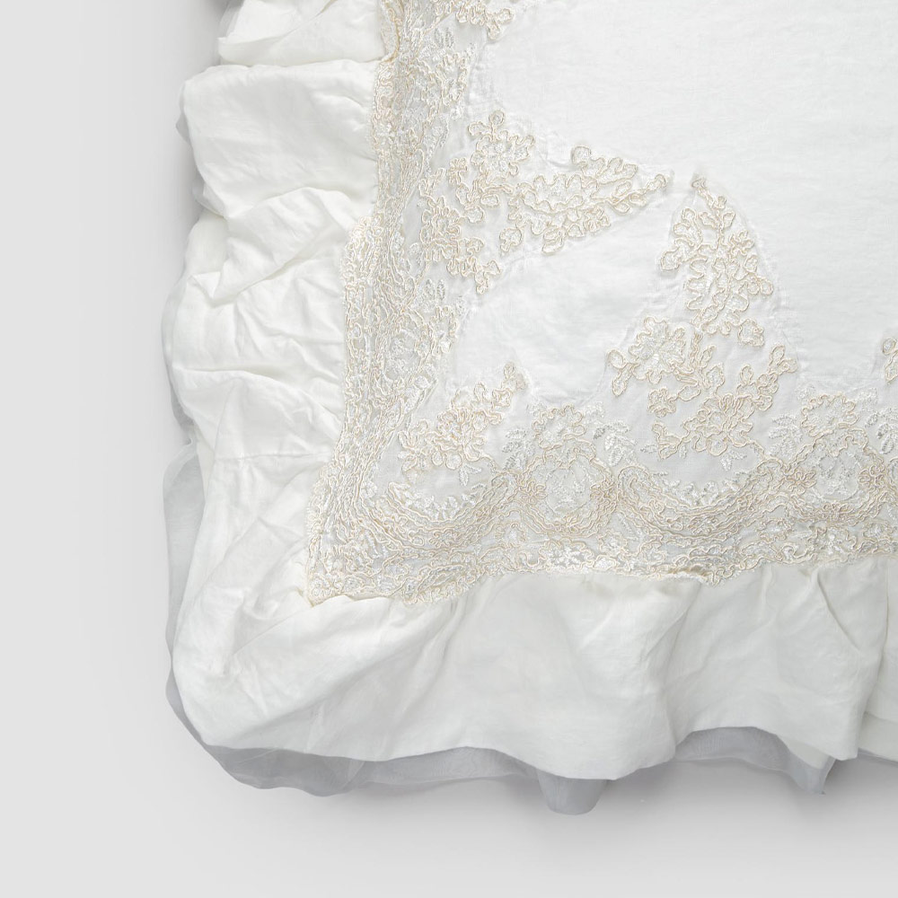Dekorativ örngott i naturligt vitt linne med elegant spets och flänsar, tillverkad i italiensk kvalitet.