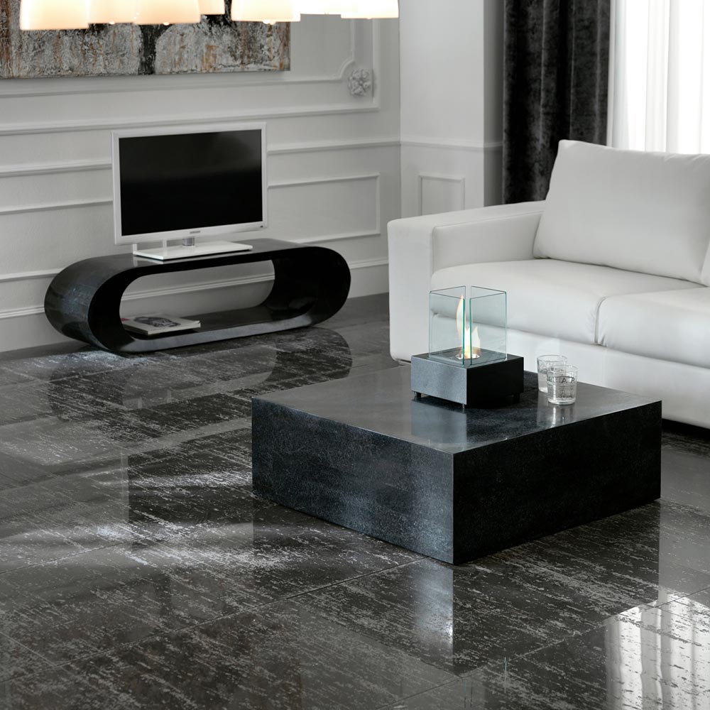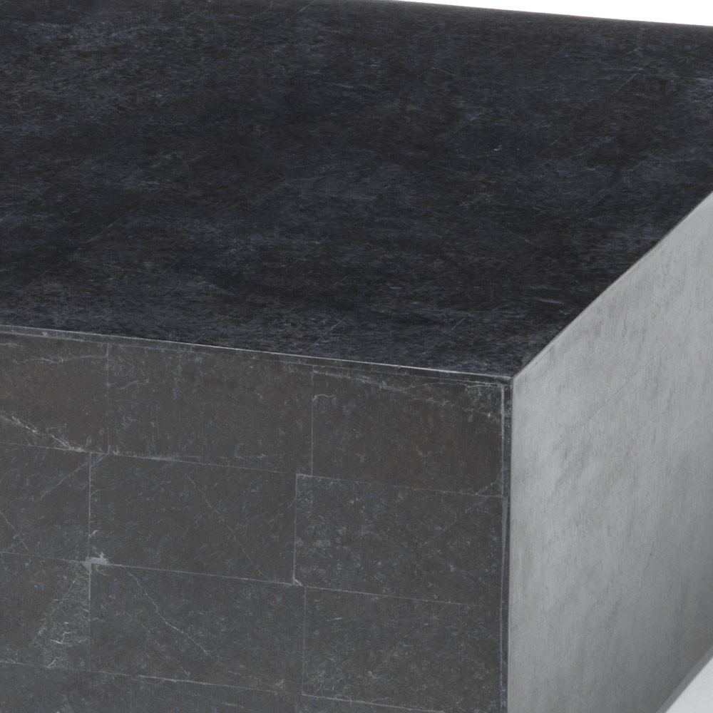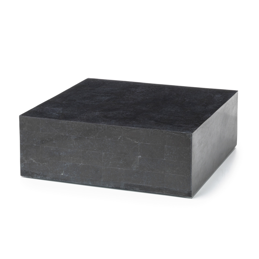 Fyrkantigt soffbord i fossil sten, svart finish.