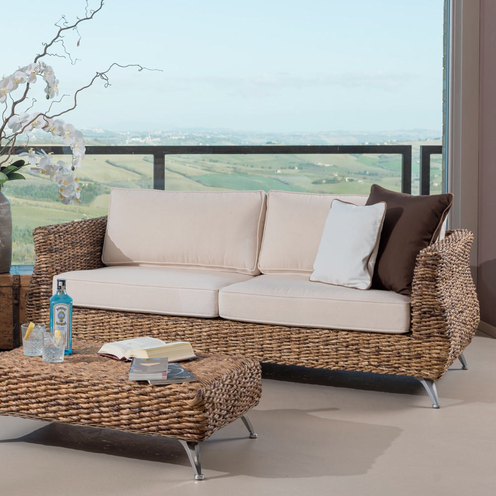 Vardagsrummet tillhör en hel kollektion som utmärker sig för sina moderna toner både i utformningen av sitsarna och i detaljen på aluminium benen . Samtidigt får den liv av värmen i den naturliga väven, handgjord med en raffinerad flätning i naturlig banan.