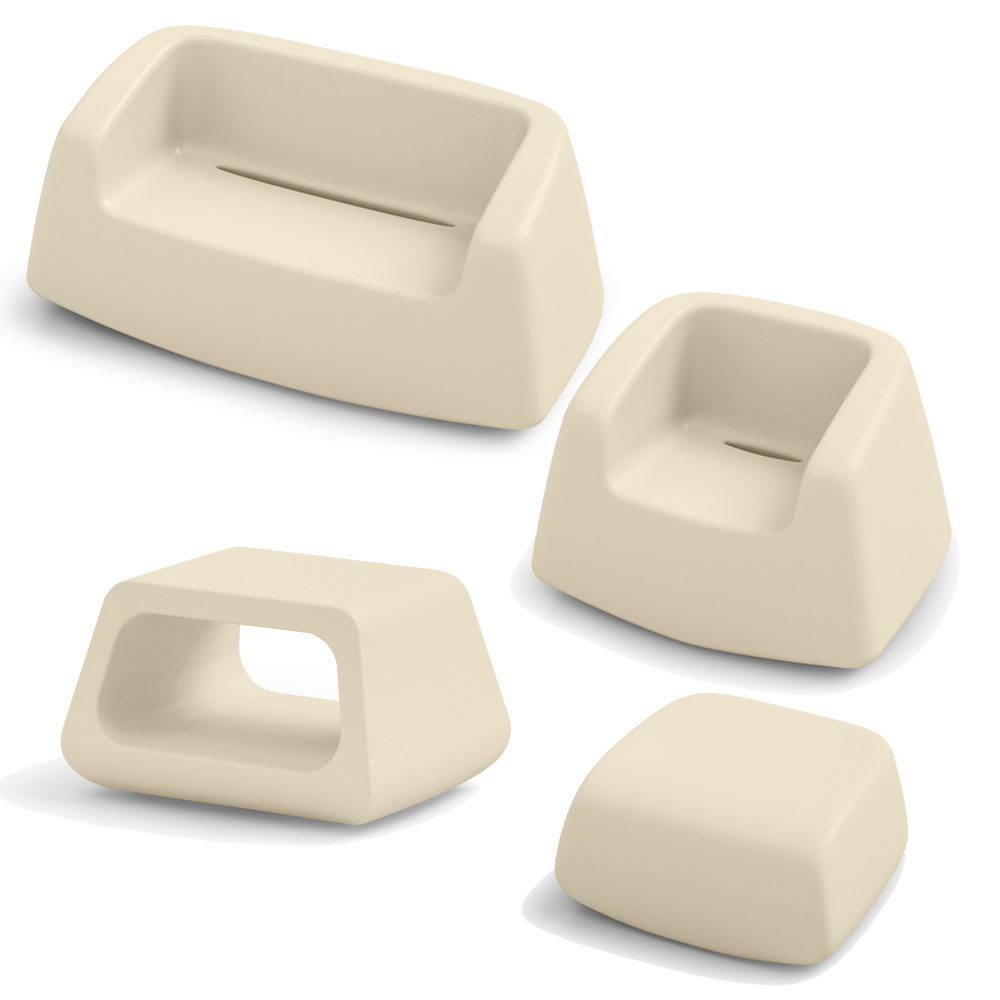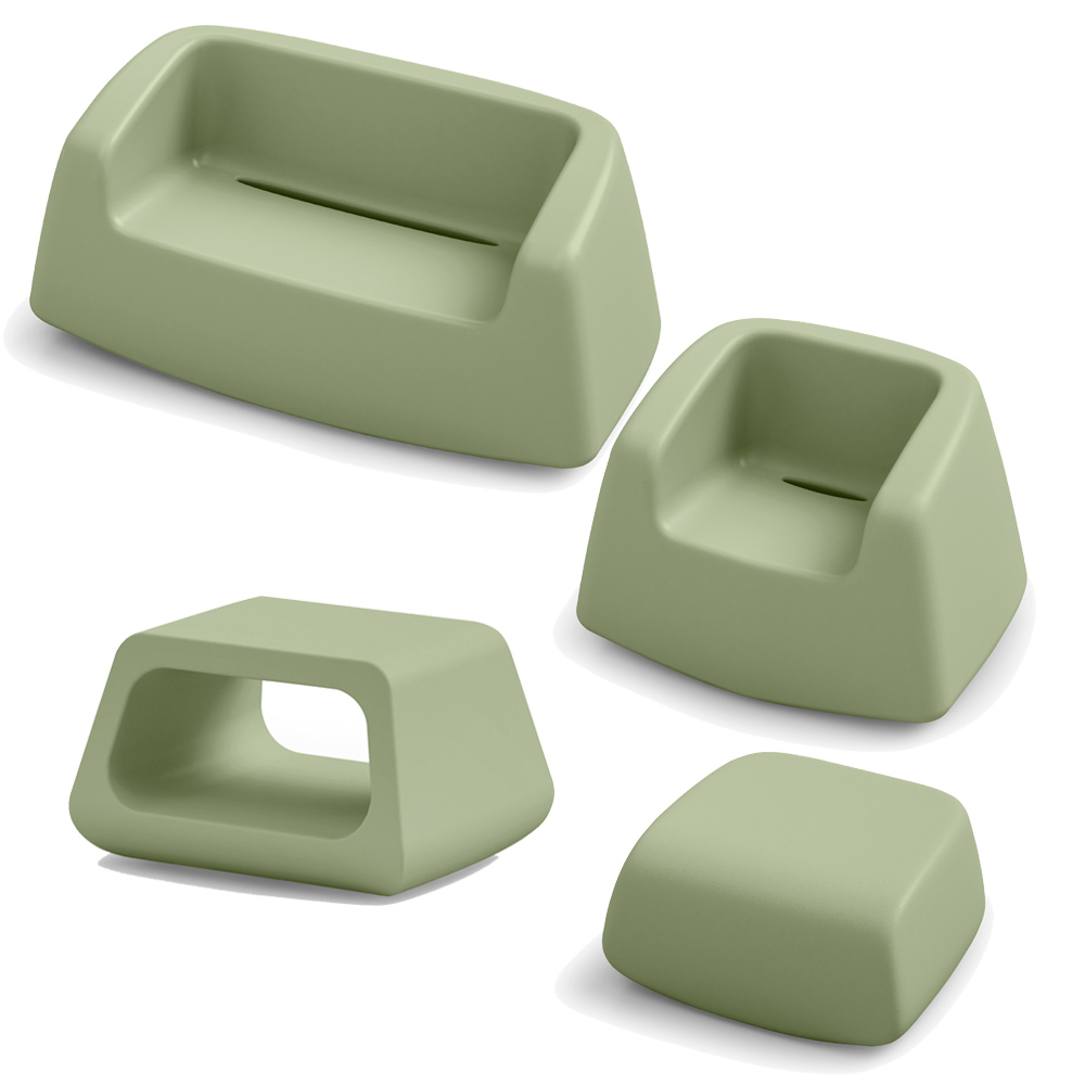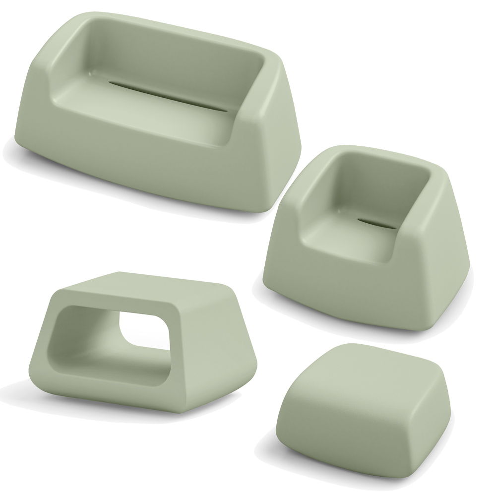 Kompositionen inkluderar en fåtölj, en soffa tillsammans med ett soffbord och en sittpuff.