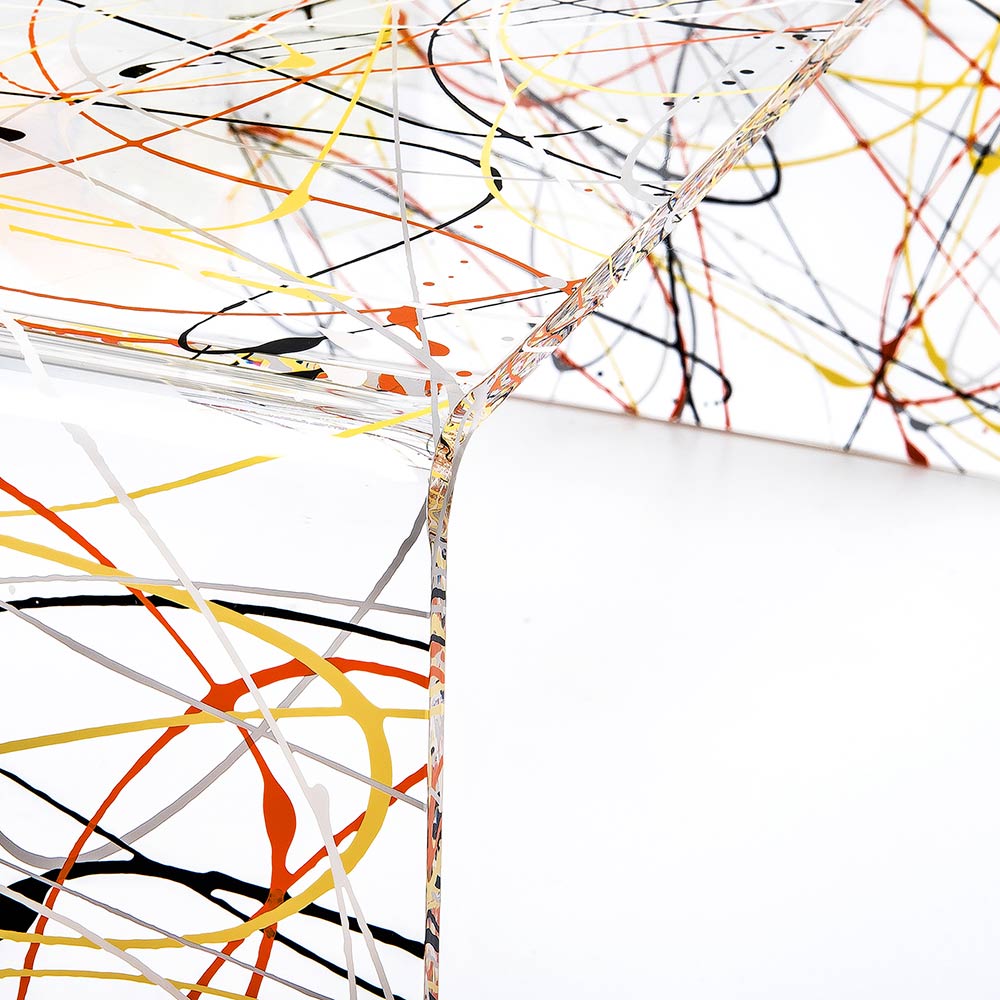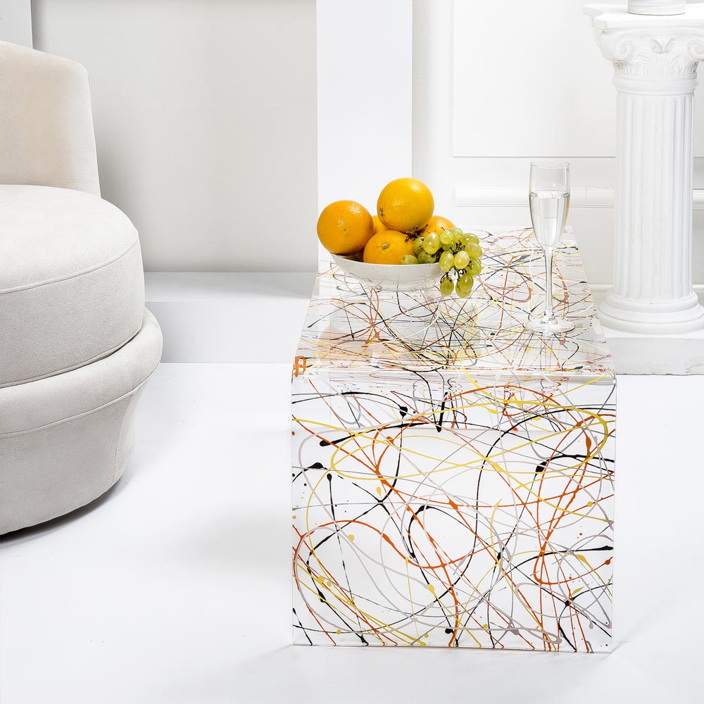 Soffbord utformat, designat och tillverkat i Italien genom användning av innovativa och kvalitetsmaterial såsom transparent plexiglas med flerfärgade dekorationer, vilket är idealiskt eftersom det är giftfritt, allergivänligt, luktfritt, antibakteriellt och 100 % återvinningsbart. Detta soffbord har designats för att förse vardagsrummet eller sovrummet med smak och funktionalitet, och fungerar som ett modernt , enkelt och mångsidigt inredningselement .