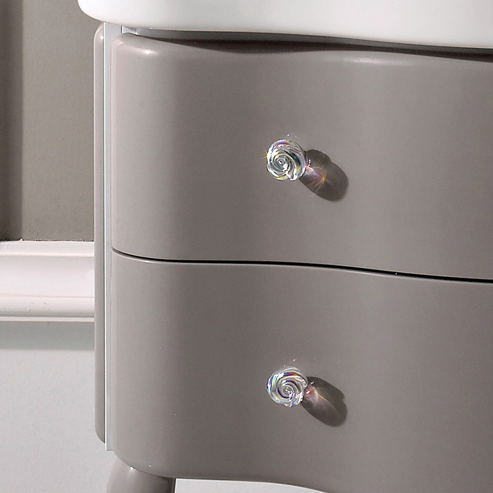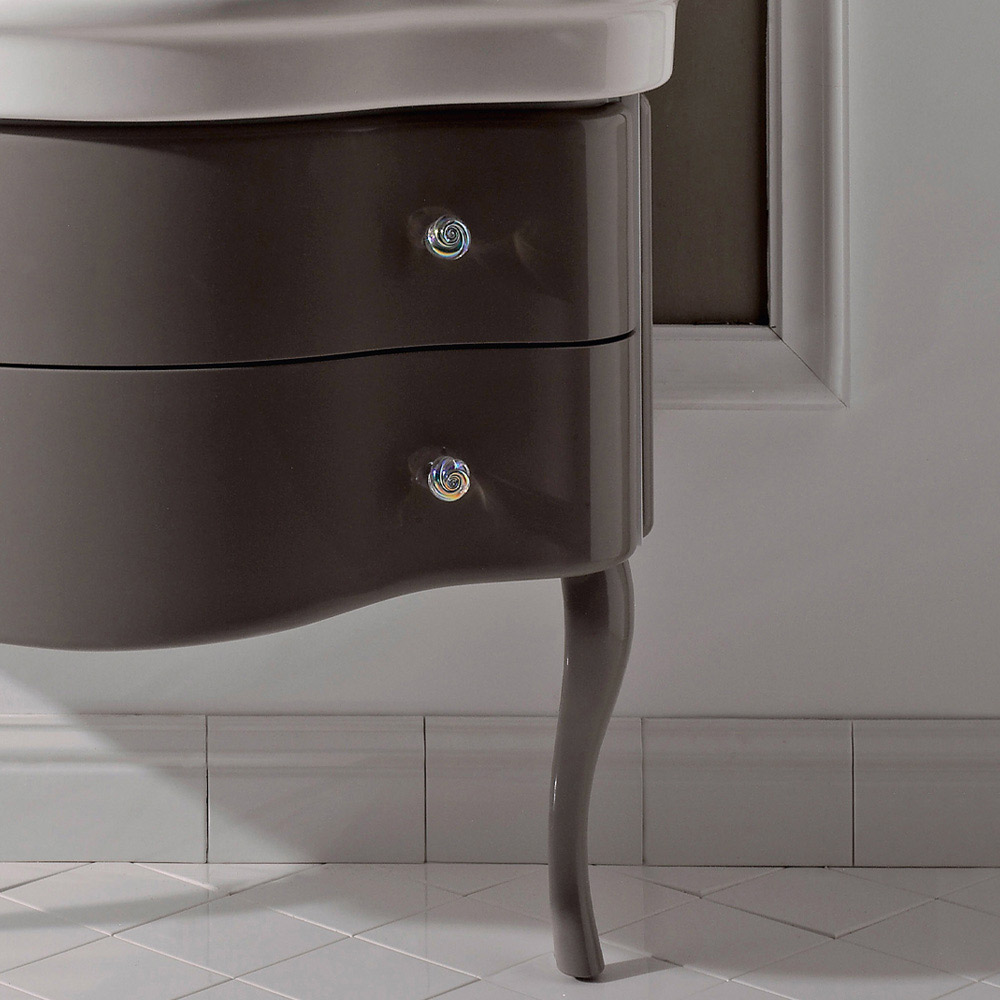 Badrumsskåp i MDF med två blanklackerade lådor,medvit keramiskhandfat . Skåpet är tvåfärgat: dörrar och ben är taupe-färgade medan strukturen är hagtornsfärgad, de rosformade mässingsknopparna ingår.