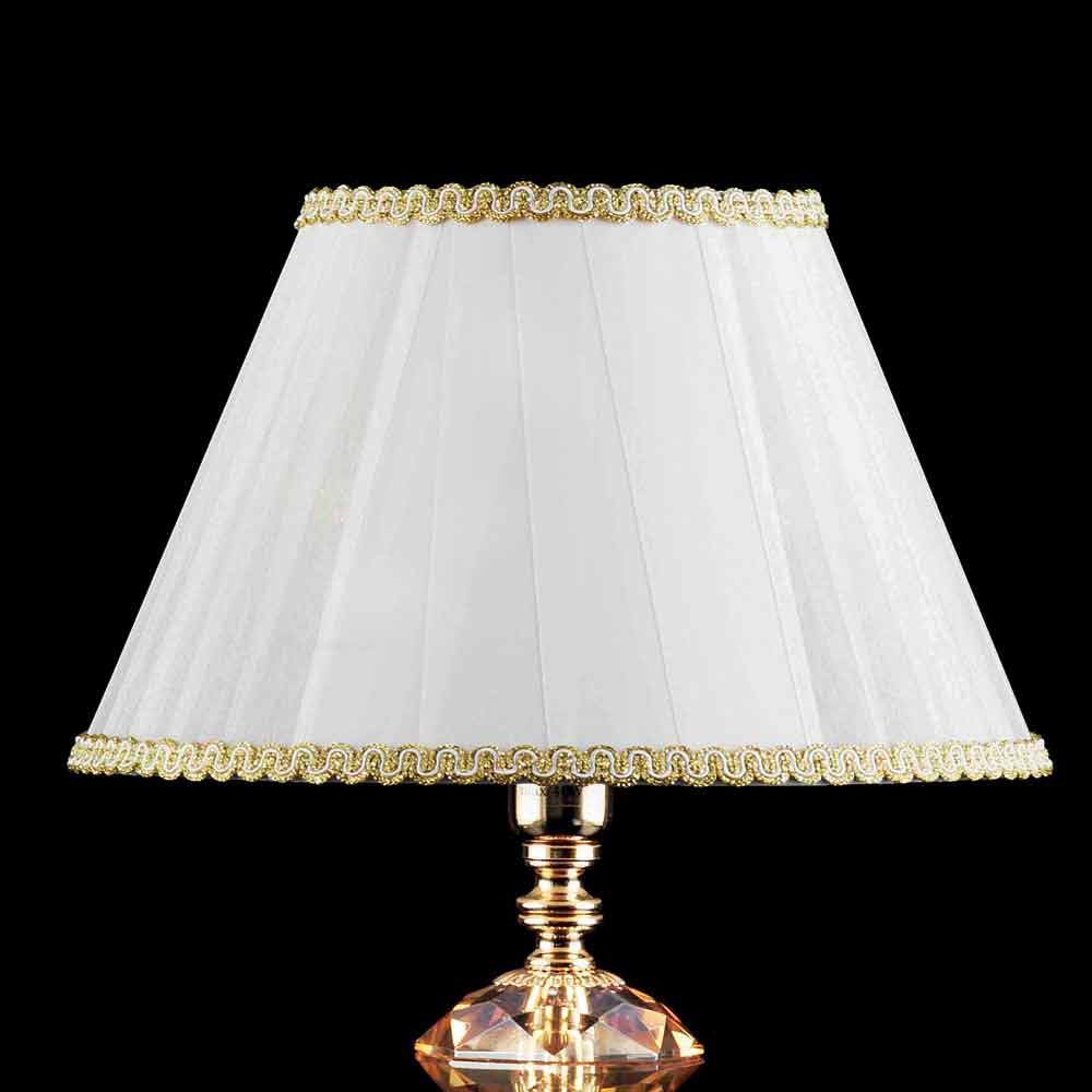 Klassisk designlampa i bärnstensfärgat glas och kristall, guldfinish. Organza och pongè lampskärm.