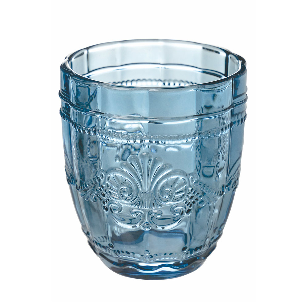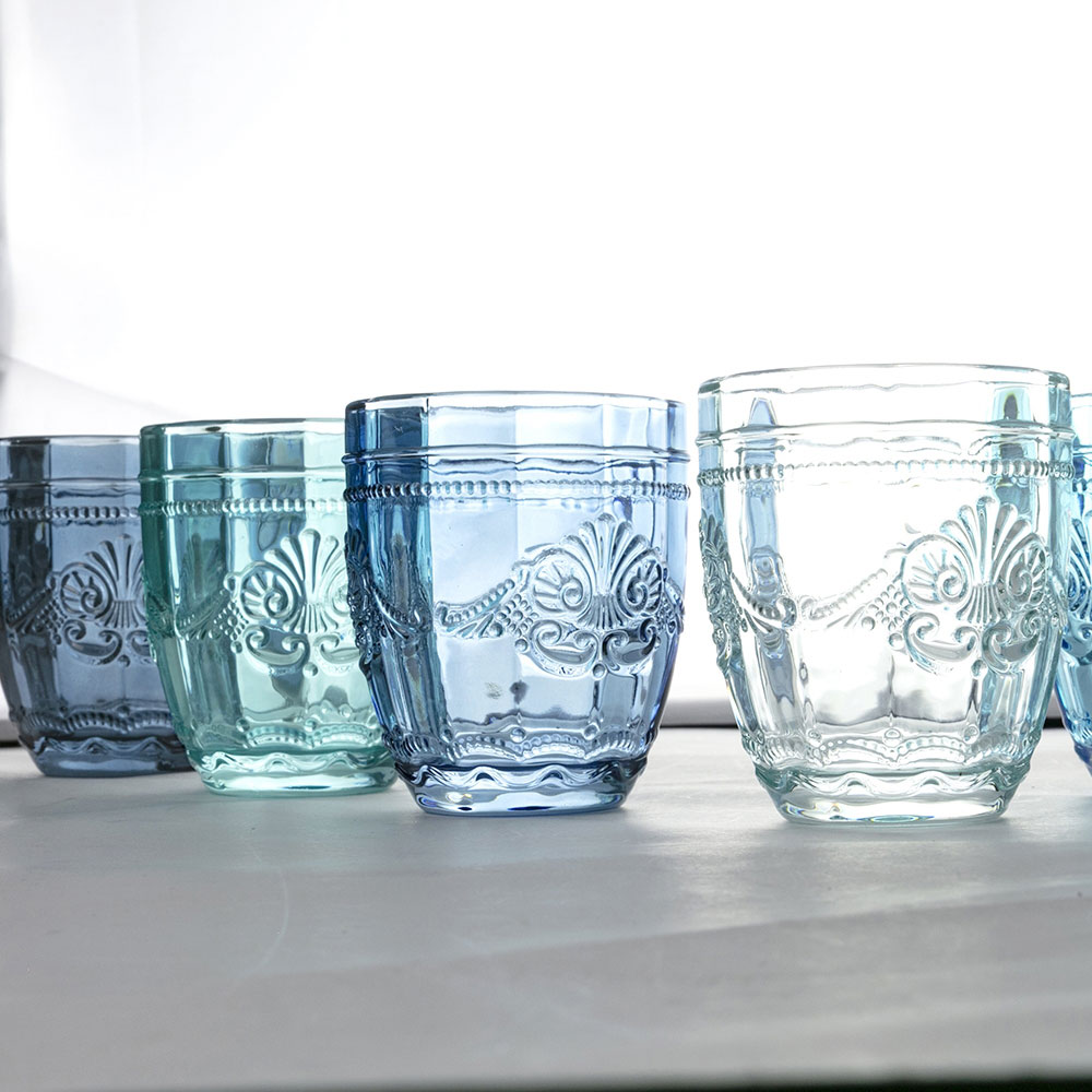 Färgade och eleganta glas i glasservering på 12 stycken för vatten.