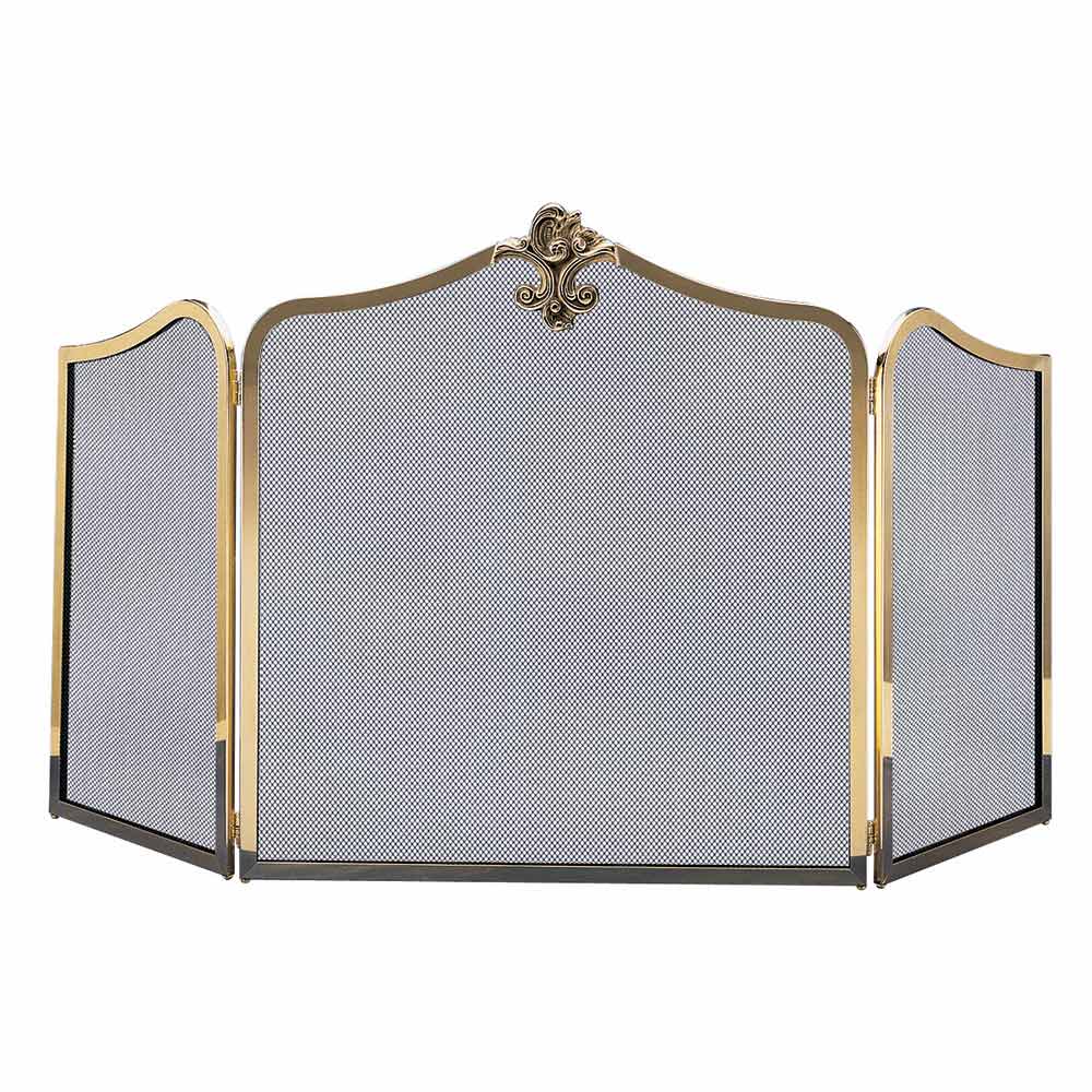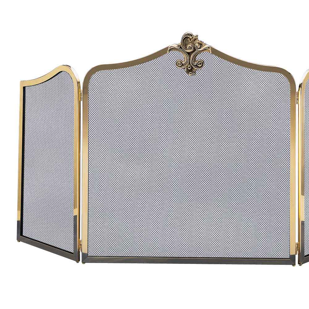 Denna gnistskärm är ett lyxigt tillbehör som kombinerar funktionalitet med en raffinerad design . Mässingsramen ramar in ett fint vävt stålnät som fångar gnistor utan att hindra sikten mot lågorna. Den övre delen är utsmyckad med en dekorativ mässingsprydnad , som ger en sofistikerad touch av gammal prakt.