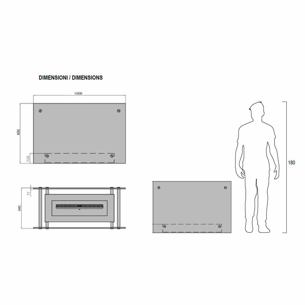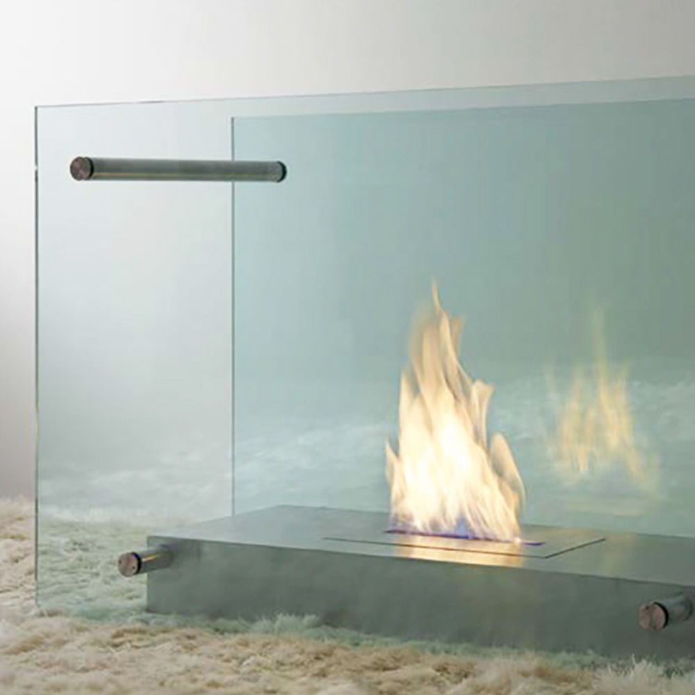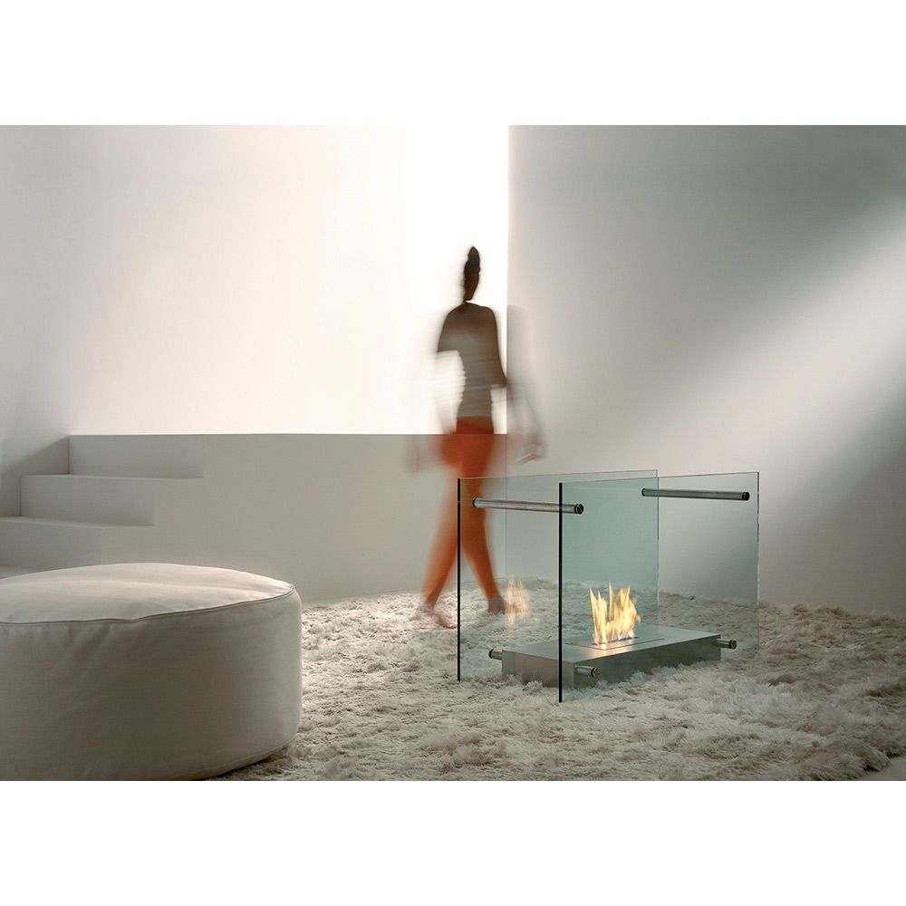 Golv bioetanol spis med modern design i stål och glas, för inomhusbruk, tillverkad i Italien.
