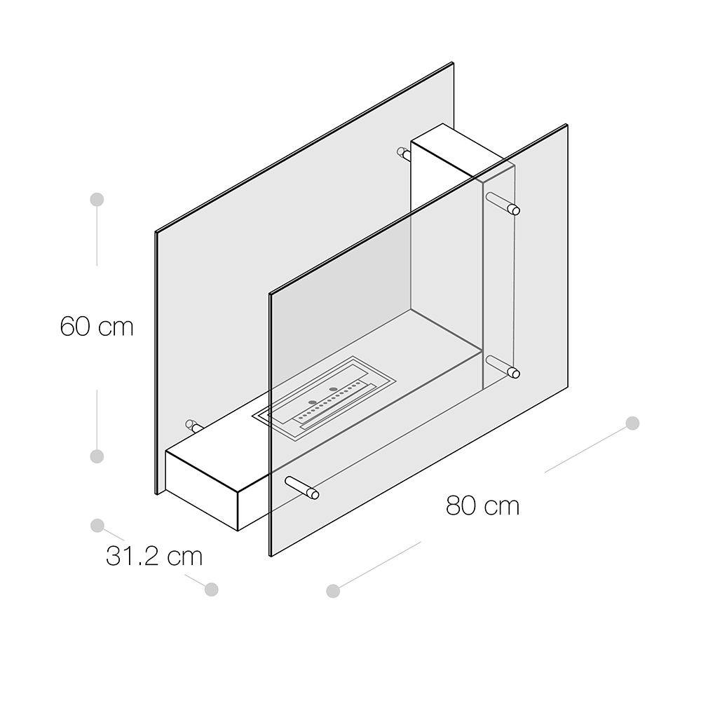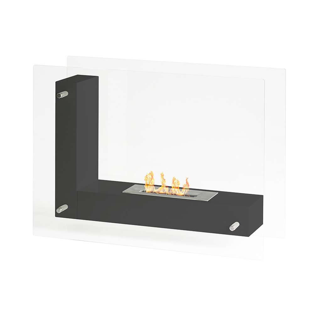 Tillverkad med en L-formad struktur i svart metall och härdat glas , placerad på sidorna, skyddar den lågan från alla vindbyar och framhäver den.
