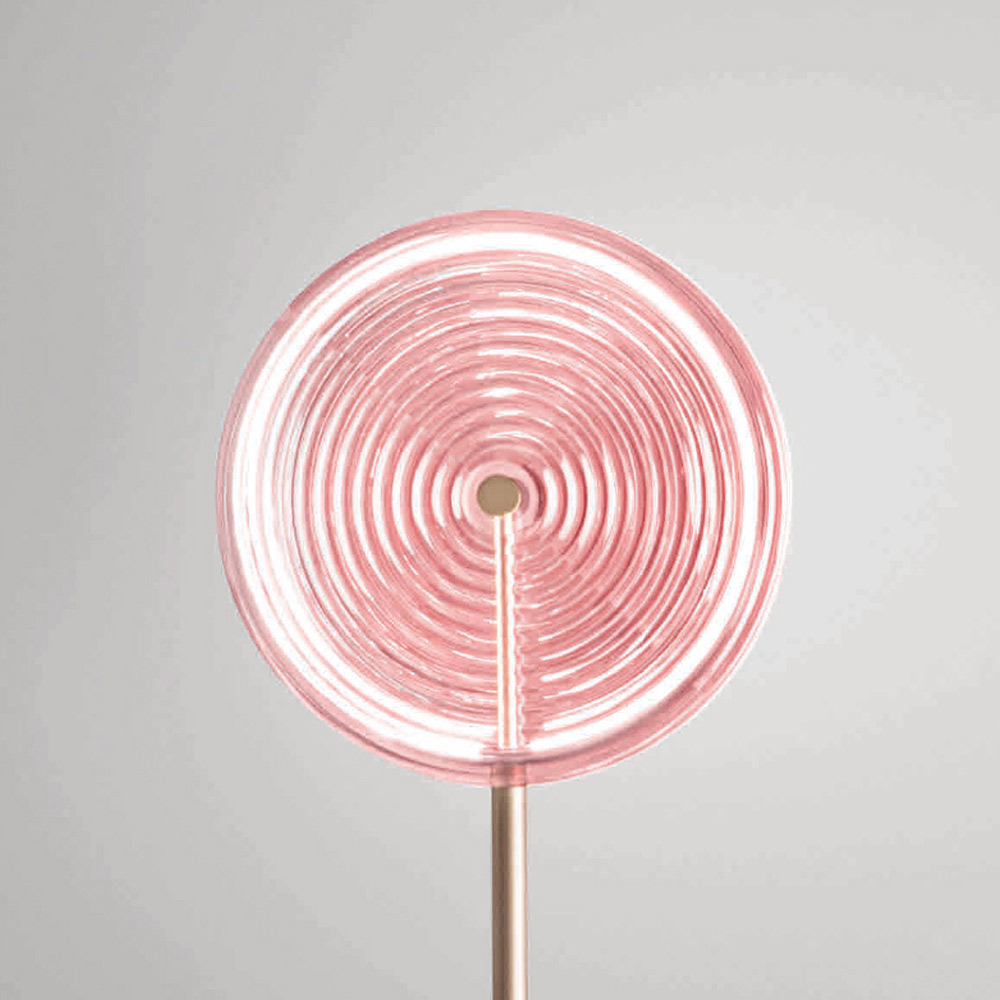 guldlackerad metall, glas dekorerad med rosa koncentriska linjer med