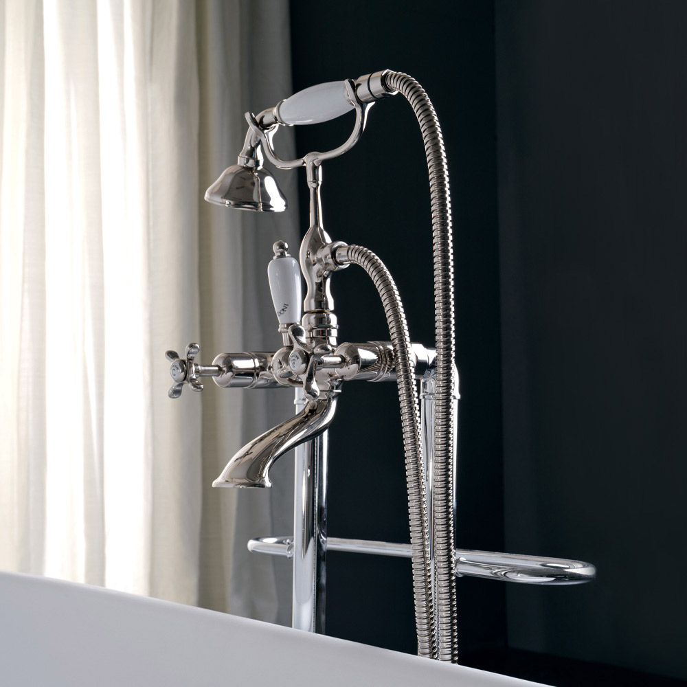 Golvmonterad badkarssatsmedhanddukshållare, duschtoalett och slang tillverkad i tung mässing, gjuten i formar som respekterar forna tiders hantverkssystem och skyddad med ett tjockt finishlager nickel.