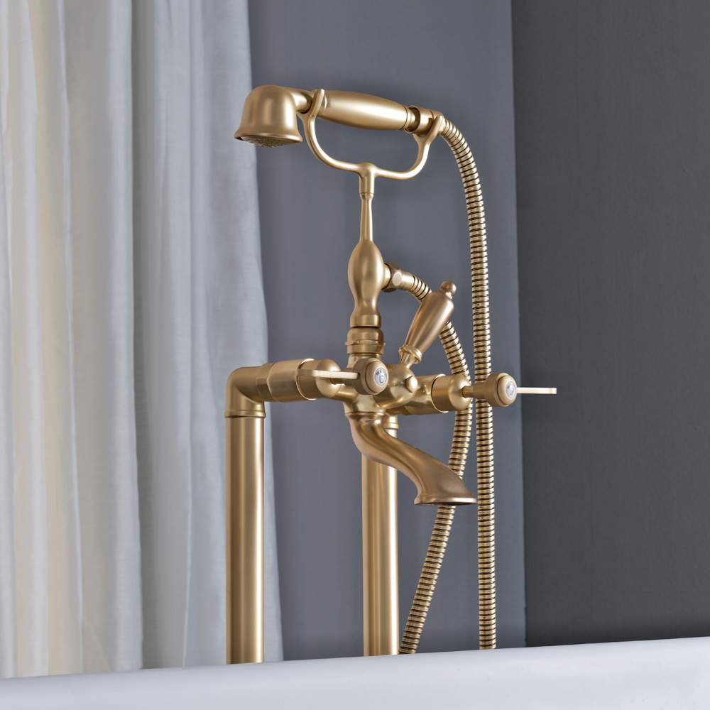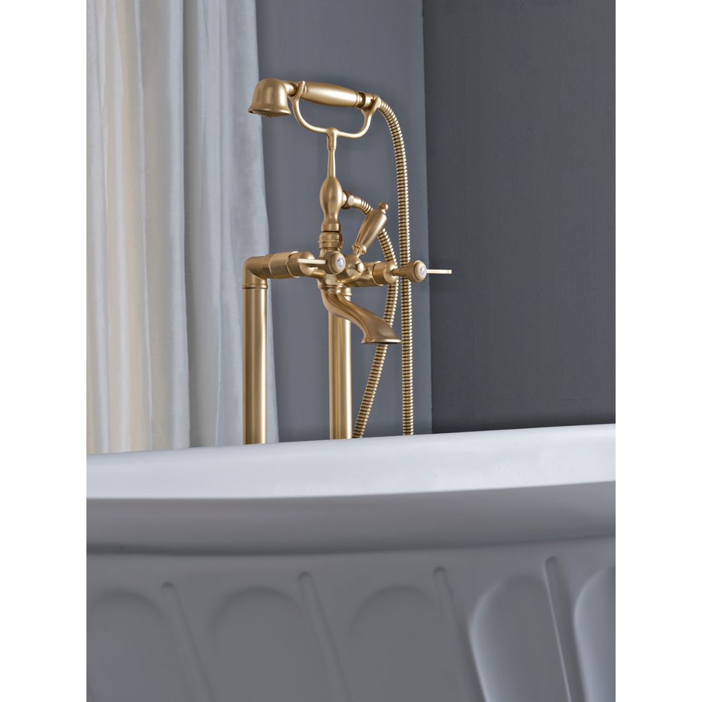 Golvmonterad badkarsenhet med handdusch och flexibel, tillverkad av tung mässing, gjuten i formar som respekterar det förflutnas hantverkssystem och skyddad med ett tjockt lager av finish matt mässing.