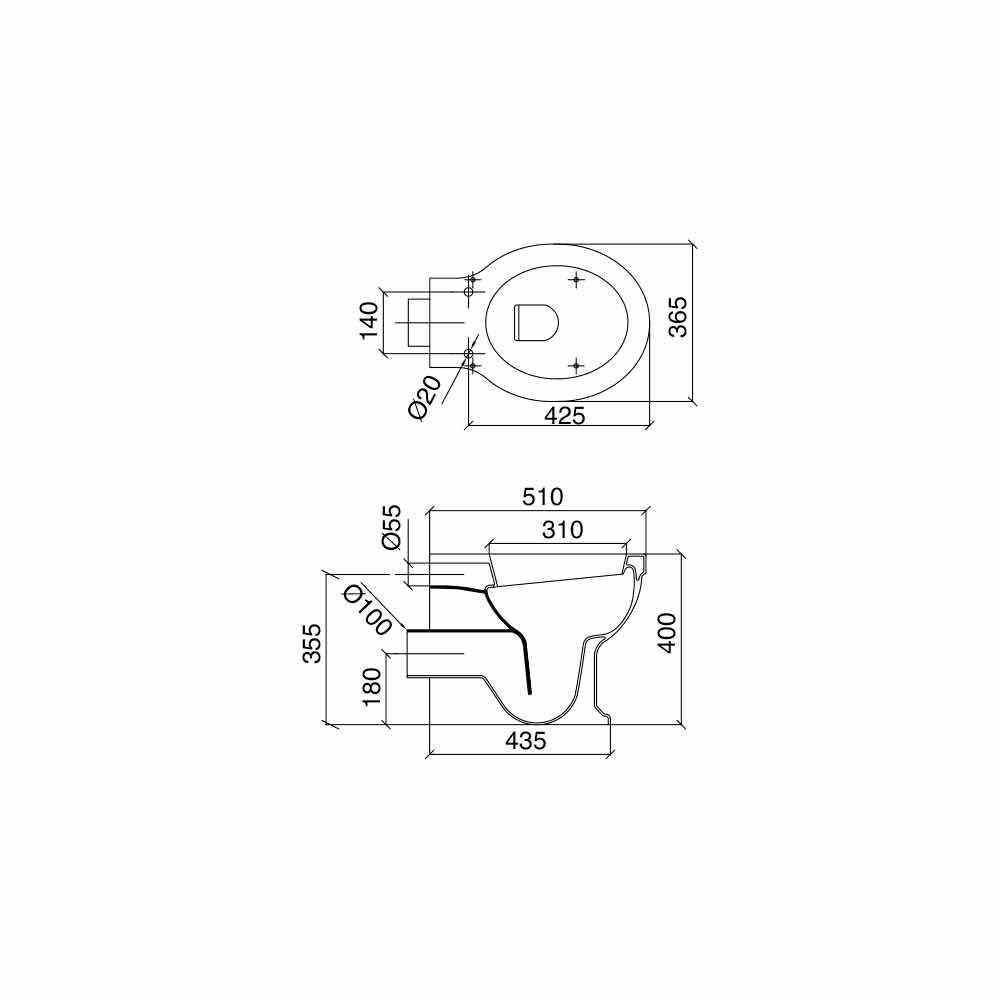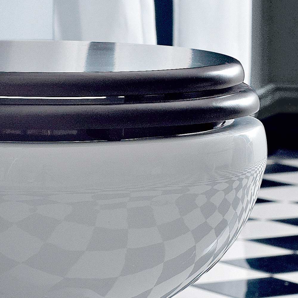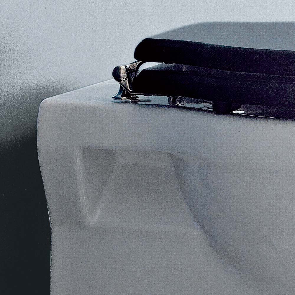 Vit keramisk toalettvase bakifrån med vita Marwa-stolar, tillverkade i Italien.