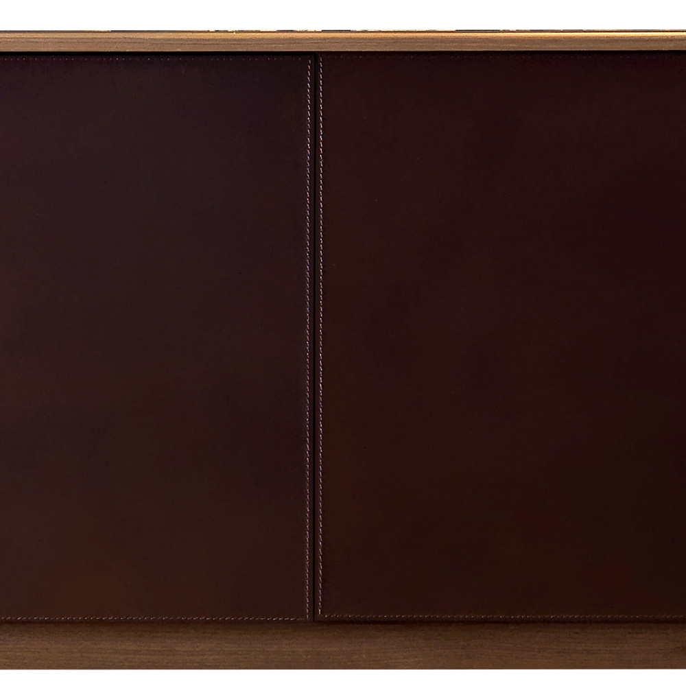 Framsidan och insidan av lådorna är täckta av naturläder, medan i den centrala delen finns hyllor i flera lager finérad med canaletto valnöt.