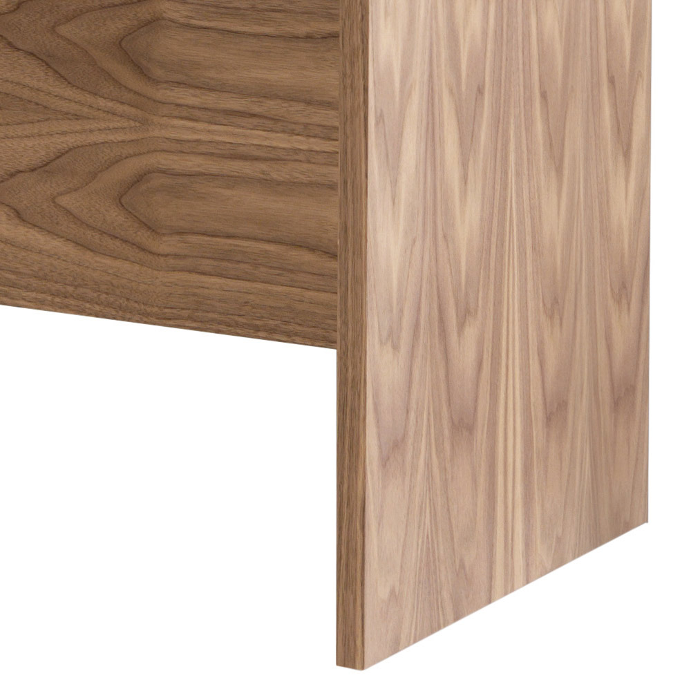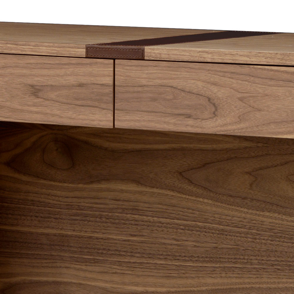 Gjord av krökt plywood finérad i canaletto valnöt med främre insatser i naturligt läder.