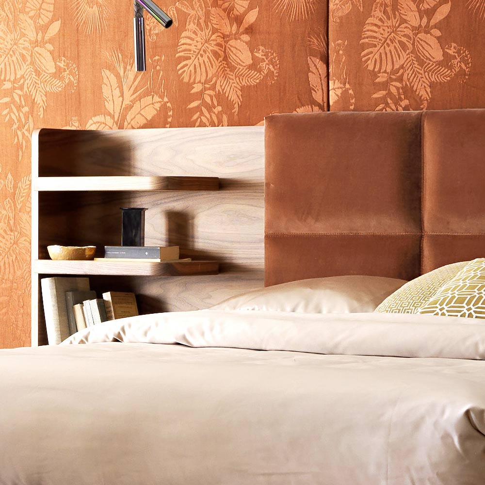 York presenterar en böjd plywoodstruktur finérd i canaletto valnöt, sängramen och hyllorna finns i fast canaletto valnöt.